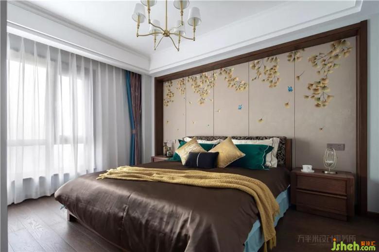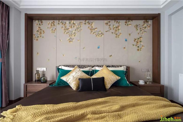 客臥選用內(nèi)嵌布質(zhì)硬包裝飾床頭。輕盈寫意的銀杏與蝶舞,生動宜人。