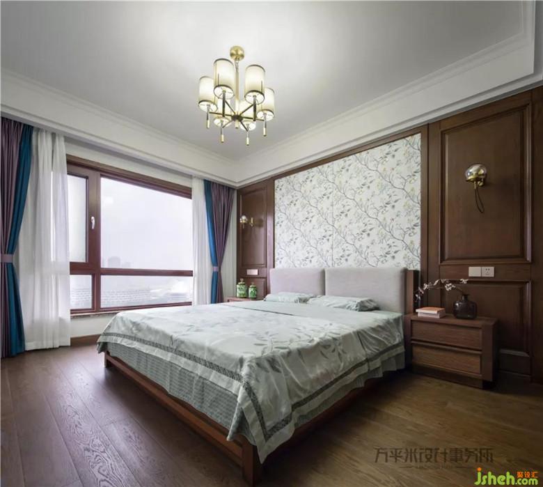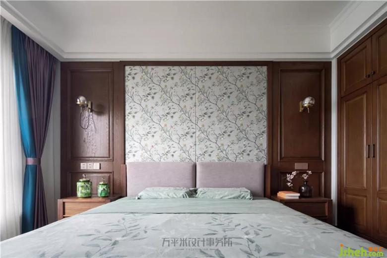 長輩臥室空間寬敞。床頭兩側(cè)雙壁燈提供輔助照明。床頭布質(zhì)硬包及床品均選用淺草綠色,清爽素凈。