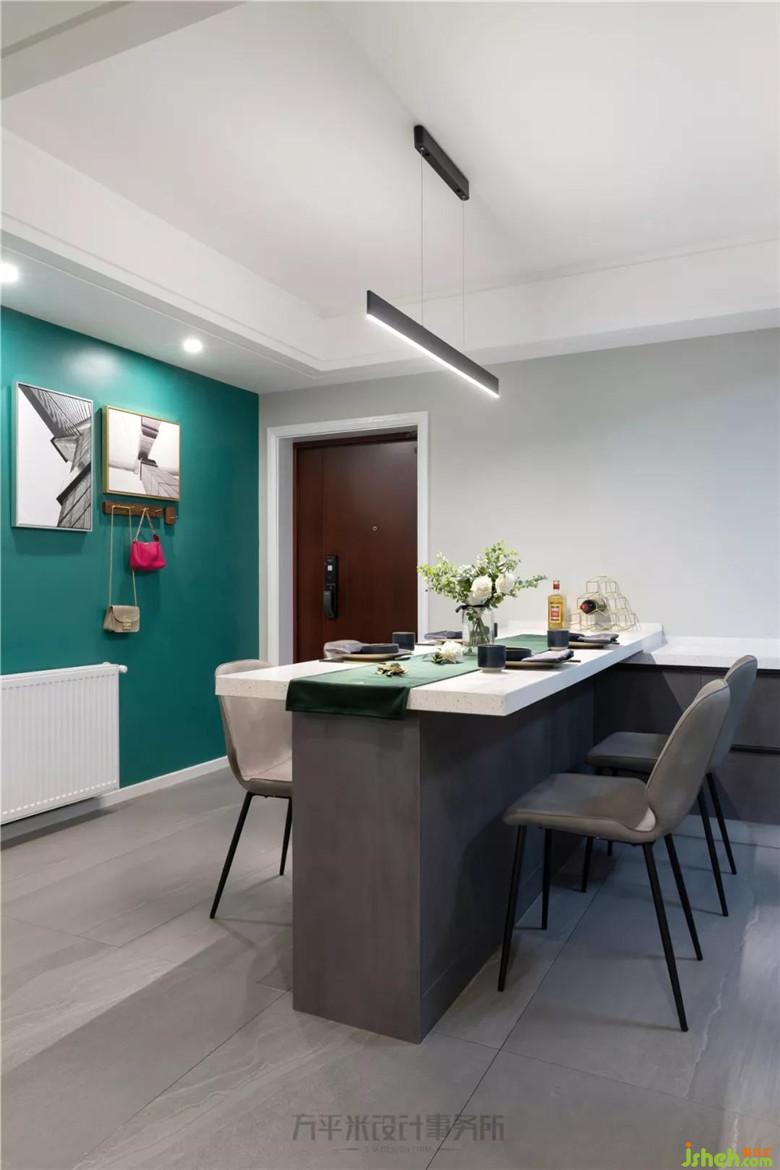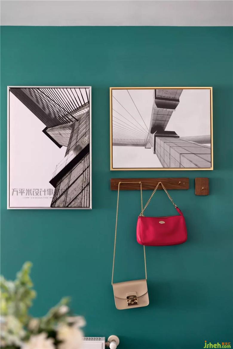 墨綠色的黑板漆隨意擦寫的特性更增添了些許生活趣味性。電表箱藏于不對稱的黑白裝飾畫后,胡桃木與黃銅的包掛,令出入間拿取便利。