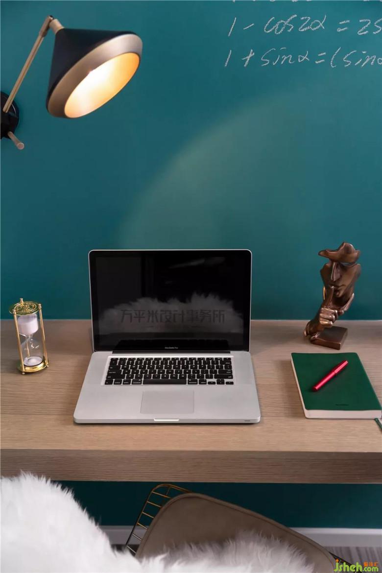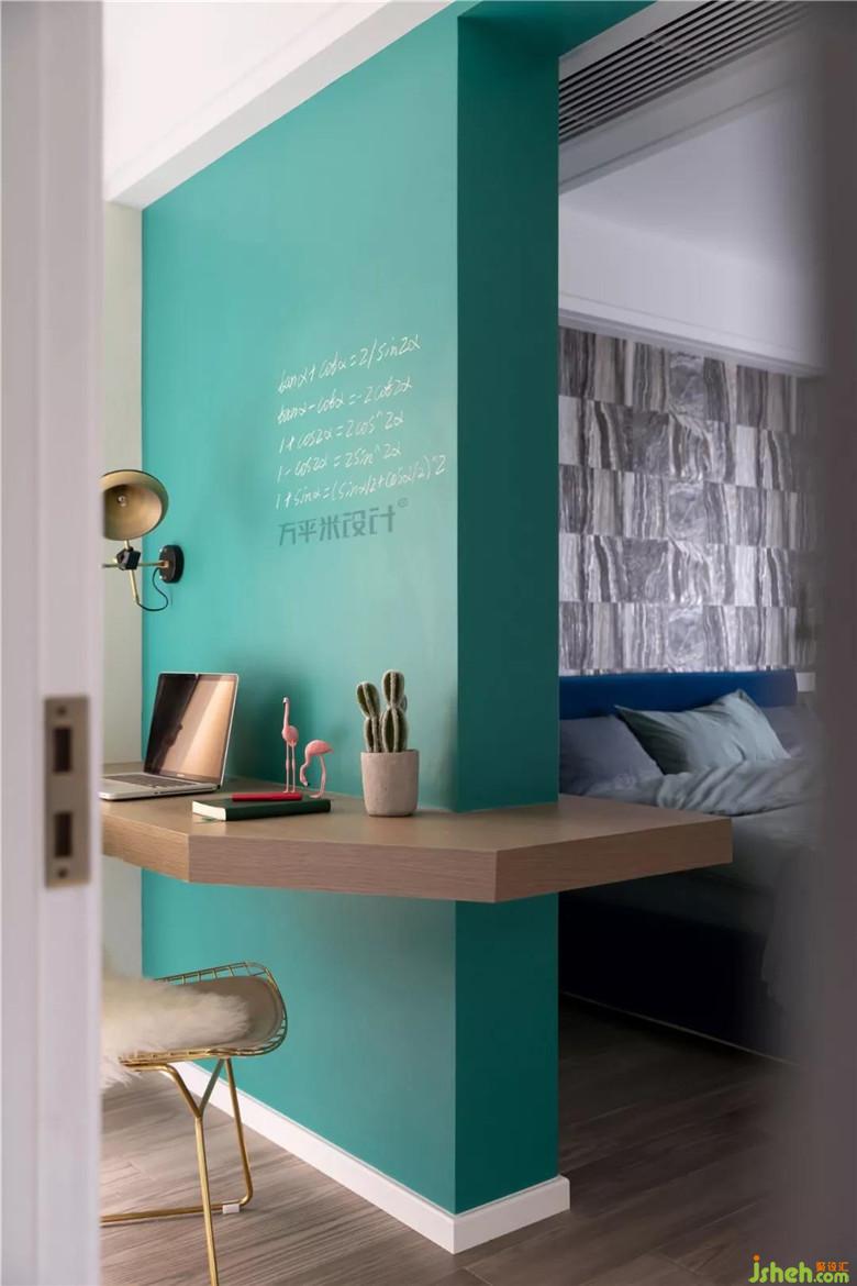 兩面都是承重墻的小面積空中花園,將原入口封閉,并入主臥內(nèi)成為開放式衣帽間及化妝間。利用落地采光窗明亮光線,提升主臥整體采光。衣柜移至衣帽間內(nèi)進(jìn)行儲(chǔ)物,釋放了原本屬于臥室的空間尺寸。無(wú)法拆除的承重墻體,涂刷上與客餐廳一致的綠色黑板漆,并在靠墻兩側(cè)制作木質(zhì)固定桌面,成為方便的小桌臺(tái),可供讀寫或化妝。