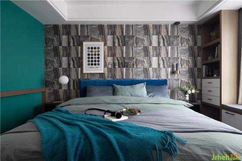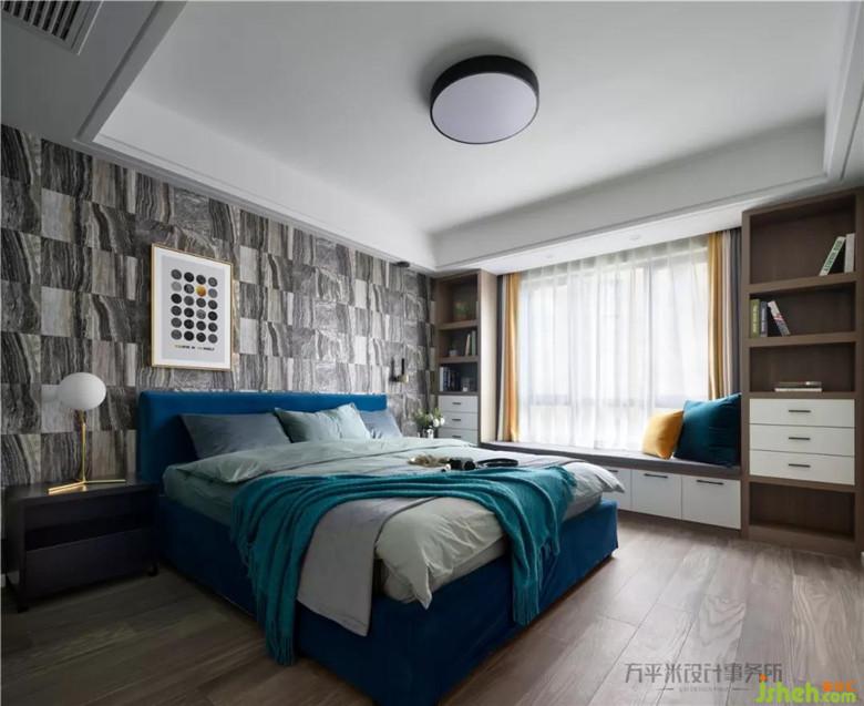 灰調(diào)藍(lán)綠色系純色布藝的使用,為空間帶來(lái)安靜典雅的氣質(zhì)。臺(tái)燈與吊燈的組合,及單側(cè)裝飾畫作,不對(duì)稱中取得平衡的美感。少許的橙黃仍是隨處可呼應(yīng)的亮點(diǎn)。沒(méi)有飄窗,那我們做一個(gè):在主臥窗臺(tái)制作出儲(chǔ)物及展示功能的飄窗,雙側(cè)原木色柜體的圍合,在松軟靠墊上享受午后閱讀時(shí)光,盡情沐浴南側(cè)溫暖陽(yáng)光。