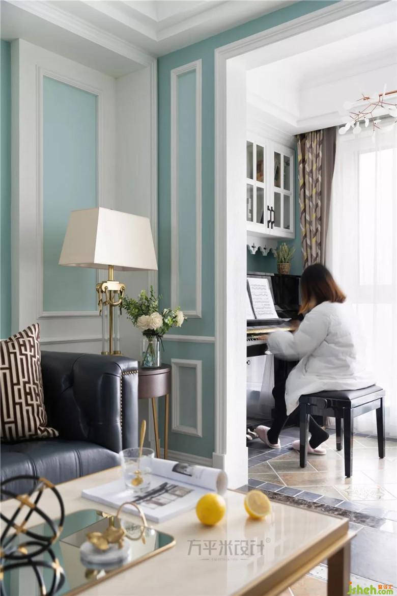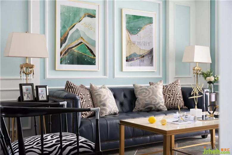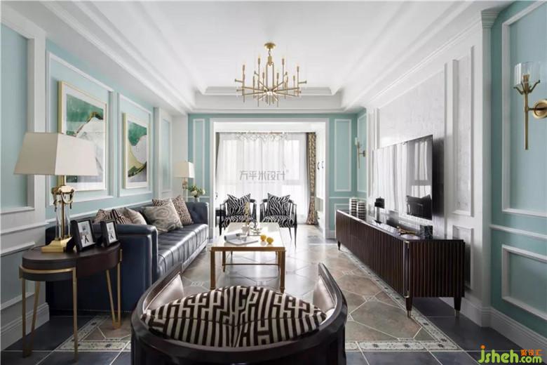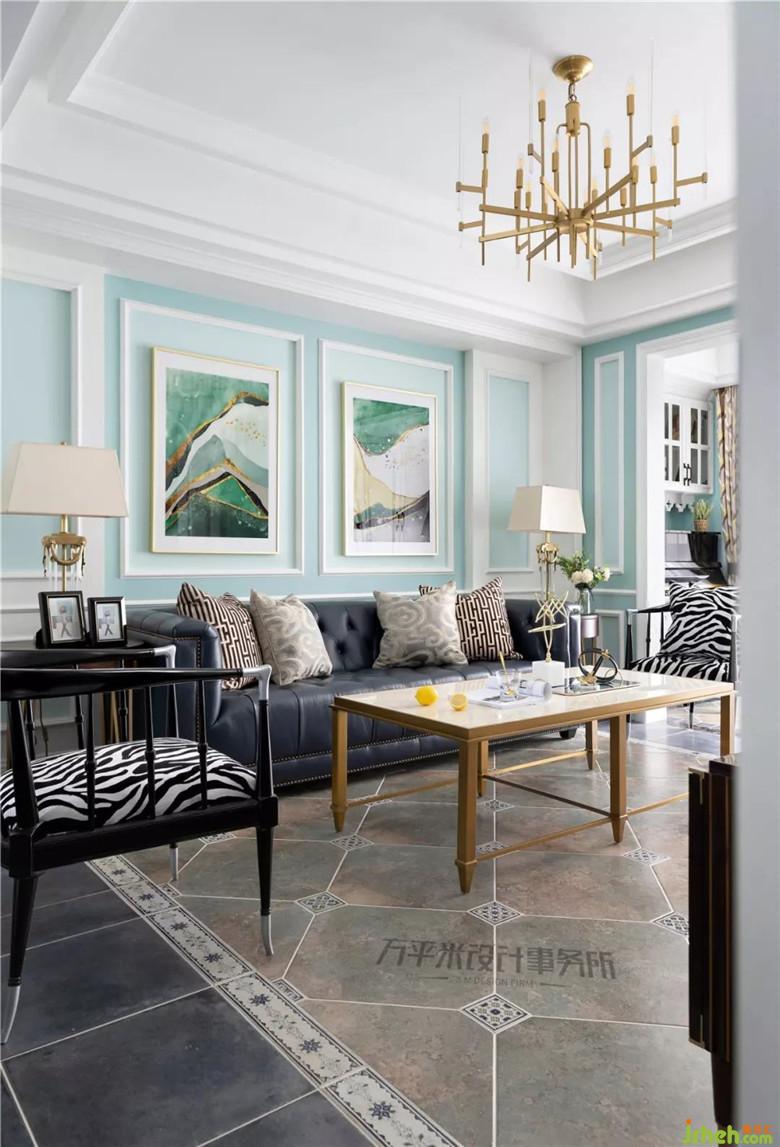 輕柔粉藍(lán)與薄荷綠墻面,純白木制勾勒,深淺漸進(jìn)將層次劃分,如海水微瀾,將淺淺波浪輕輕送抵海岸。安靜甜美的色彩語(yǔ)言,使歸家的心被溫柔撫慰,洗去一天忙碌的浮躁。精致黃銅元素,體量輕盈保持空間開闊通透,金屬光澤傳遞特有高級(jí)質(zhì)感。四周深藍(lán)色地磚拼花與家具用色呼應(yīng),中心地毯區(qū)域大地色系增添溫暖感受。深藍(lán)定制沙發(fā),同色系沉穩(wěn)用色將重心壓低。而定制裝飾畫作恰如其分嵌入線框內(nèi)。于畫面色彩及比例分隔均呼應(yīng)全屋。