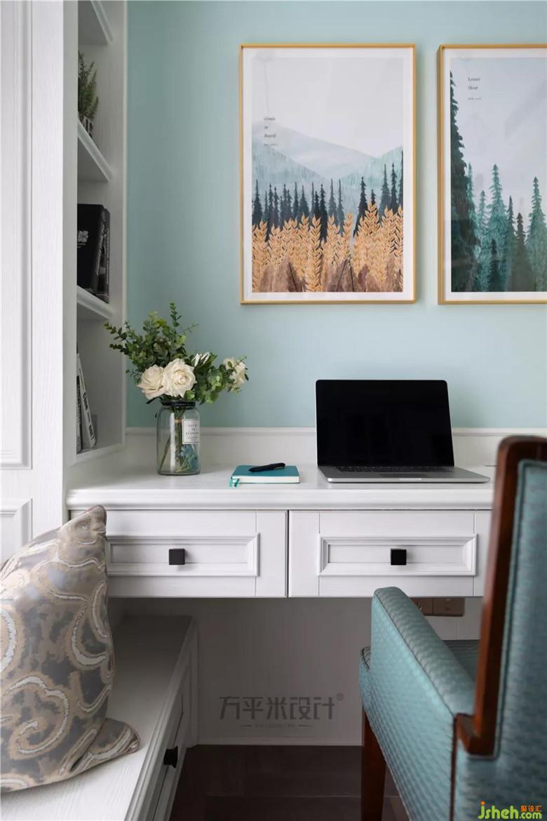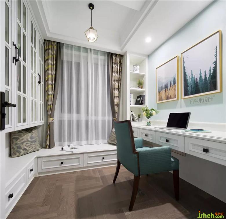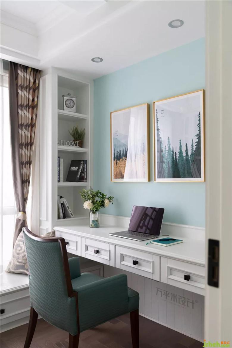 將中庭與空中花園改為更具私密性的獨(dú)立書房,水紋玻璃房門將自然光線引入走廊區(qū)域。房間面積不大,為保證書桌區(qū)域的清爽,將開放式書柜設(shè)置在書桌兩側(cè)。書桌背側(cè)木質(zhì)擋板,便于清潔。L型一體地臺于左側(cè)書柜下方可置物,靠窗一側(cè)則是飄窗形式,可坐可臥。保持空間感的同時(shí)又具實(shí)用性。