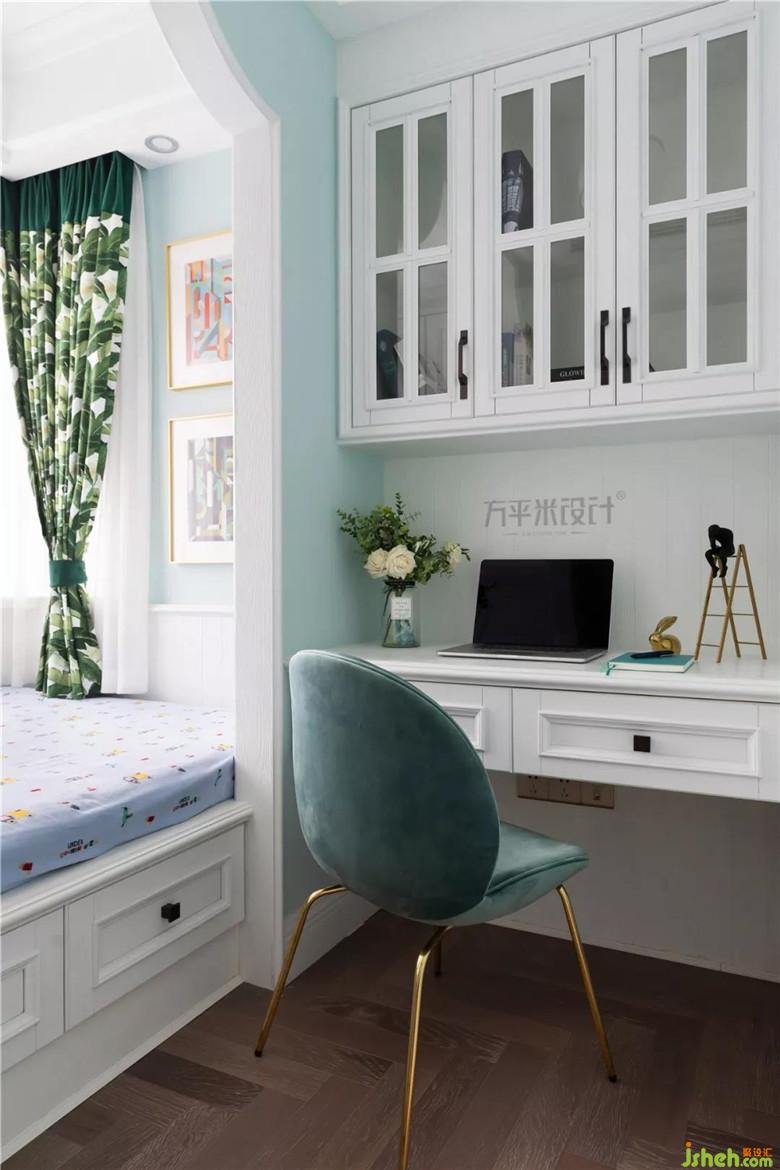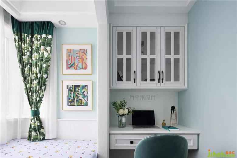不足六平的兒童房,靠窗一側(cè)是L型采光窗,考慮難以常規(guī)放置成品家具,采用儲物式榻榻米與定制書桌的形式實(shí)現(xiàn)幾大功能。床尾一側(cè)為滿墻儲物柜成為收納空間。造型隔墻弧形門洞增加童趣,并讓床鋪區(qū)域略微圍鑲內(nèi)收。于靠床一側(cè)設(shè)置壁燈開關(guān)及安全插座。木質(zhì)護(hù)墻板便于打理。窗簾與掛畫色彩呼應(yīng)。