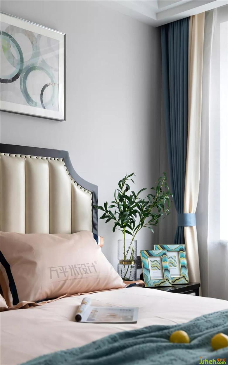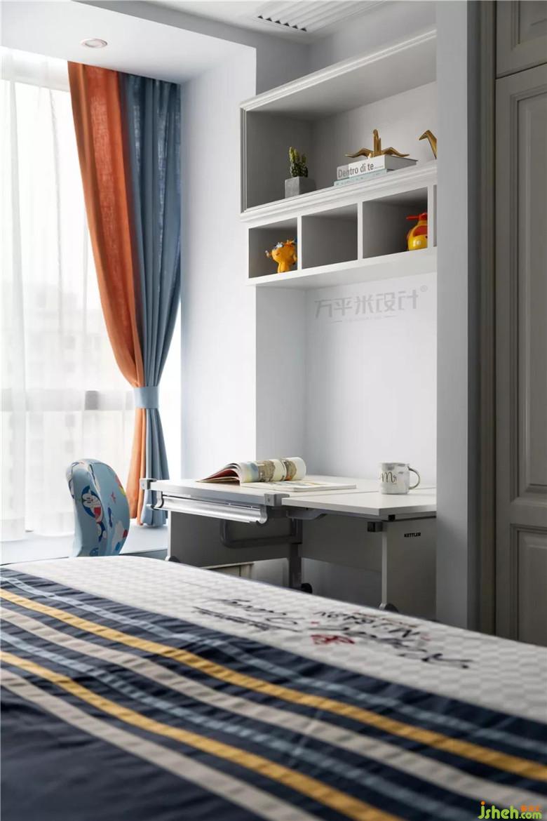 兒童房不同于其他房間,為男孩子選用了更為明快的淡藍色墻面,利用原有的設備平臺外拓,設置出可供小憩的飄窗。為成長中的孩子所使用的活動式升降桌椅預留出位置,并有固定吊柜方便置物。