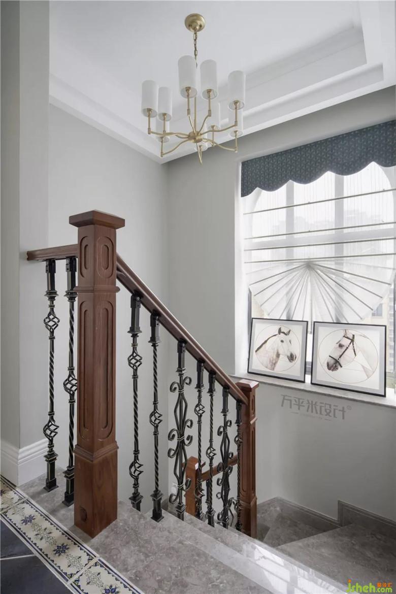 樓梯間采用暖灰大理石踏步,方便日后清理維護(hù)。扶手采用原木質(zhì)感搭配鐵藝欄桿,優(yōu)雅而不失莊重。