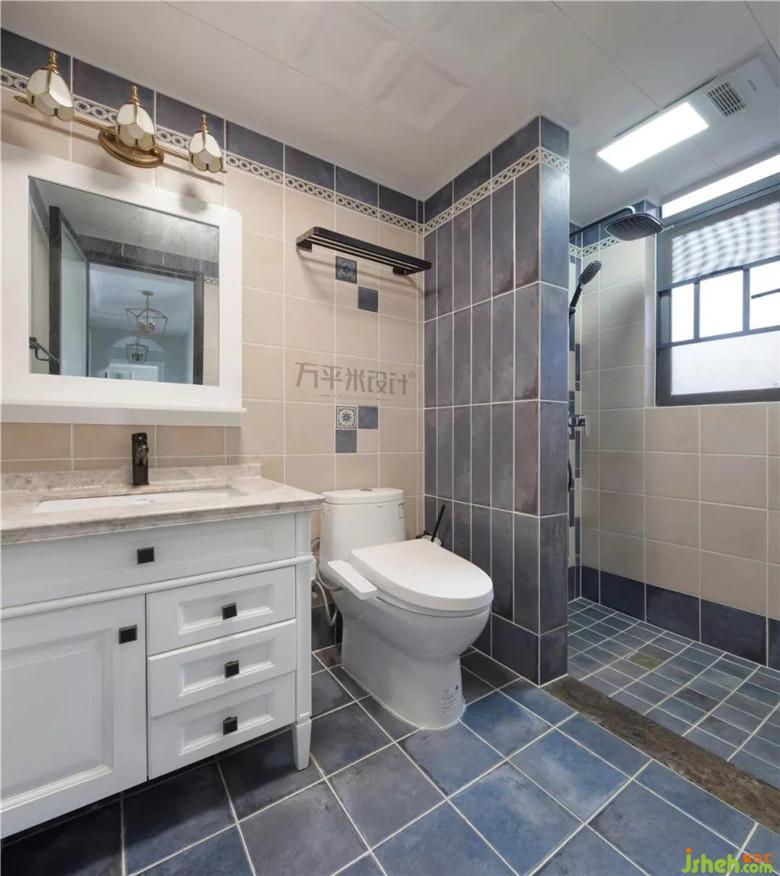 二層衛(wèi)生間,采用藍(lán)色與米色瓷磚進(jìn)行搭配,對(duì)比明顯,層次分明。采用半隔斷的方式將淋雨區(qū)與干區(qū)進(jìn)行分離,相對(duì)獨(dú)立而又協(xié)調(diào)統(tǒng)一。