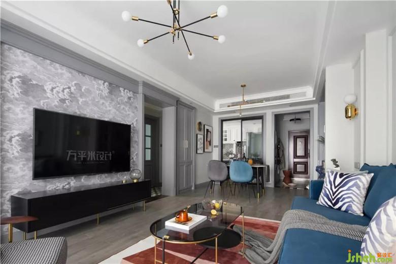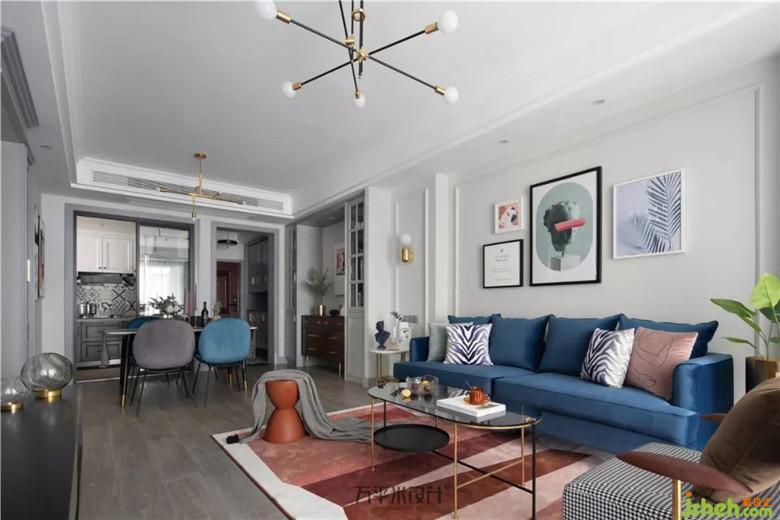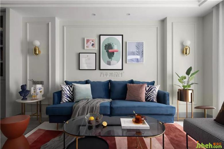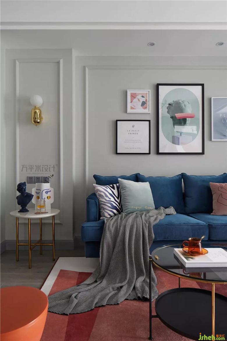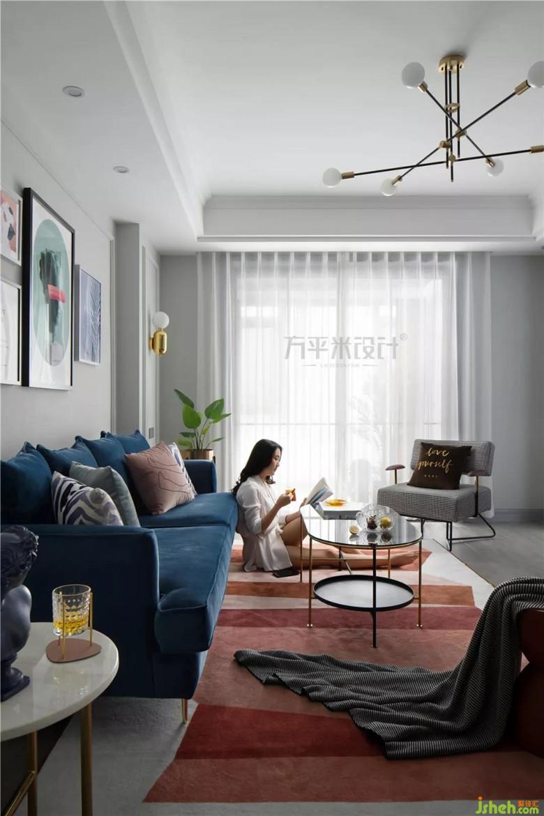 撞色的靛藍(lán)絲絨沙發(fā)與磚紅地毯,觸感細(xì)膩溫柔,隨意而放松。色彩躍動(dòng),成為空間亮點(diǎn)。復(fù)古的千鳥(niǎo)格單椅,相映成趣。主臥入口調(diào)整至電視墻一側(cè)后,設(shè)計(jì)師將其與走廊門洞形成整體、做出具有層次的造型。調(diào)整尺寸后使電視墻面與沙發(fā)背景得以居中對(duì)稱。簡(jiǎn)約的線框墻面圍合沙發(fā)主位,特意選用不對(duì)稱的組合畫作裝點(diǎn),營(yíng)造隨意無(wú)拘的輕松感。輕盈的茶幾及邊幾的選擇,從體量上釋放客廳空間。使令會(huì)客區(qū)域更顯通透舒適。