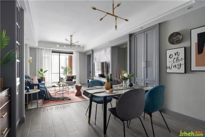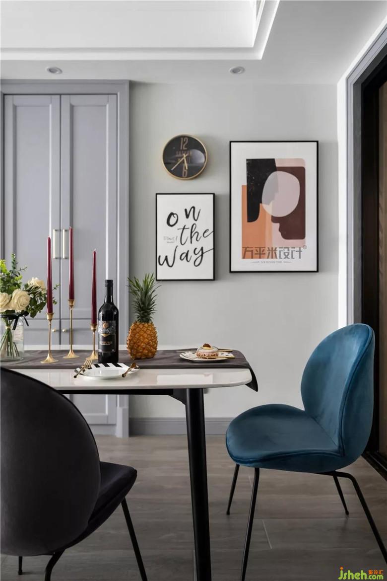 精致而輕盈的大理石餐臺,令就餐環(huán)境寬松通透,承載著每日飽含愛心的餐點。溫柔霧霾藍與淺灰色餐椅撞色相搭,呼應于同一開敞空間的靛藍沙發(fā)用色。
