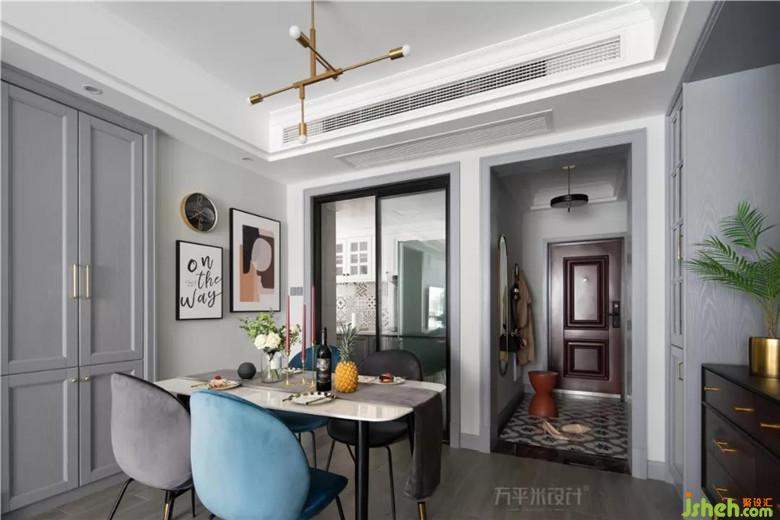 廚房入戶門從門廳處移至餐廳側(cè),令相鄰的功能區(qū)間動線縮短,趨于合理,并提升兩空間采光。