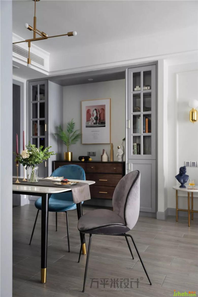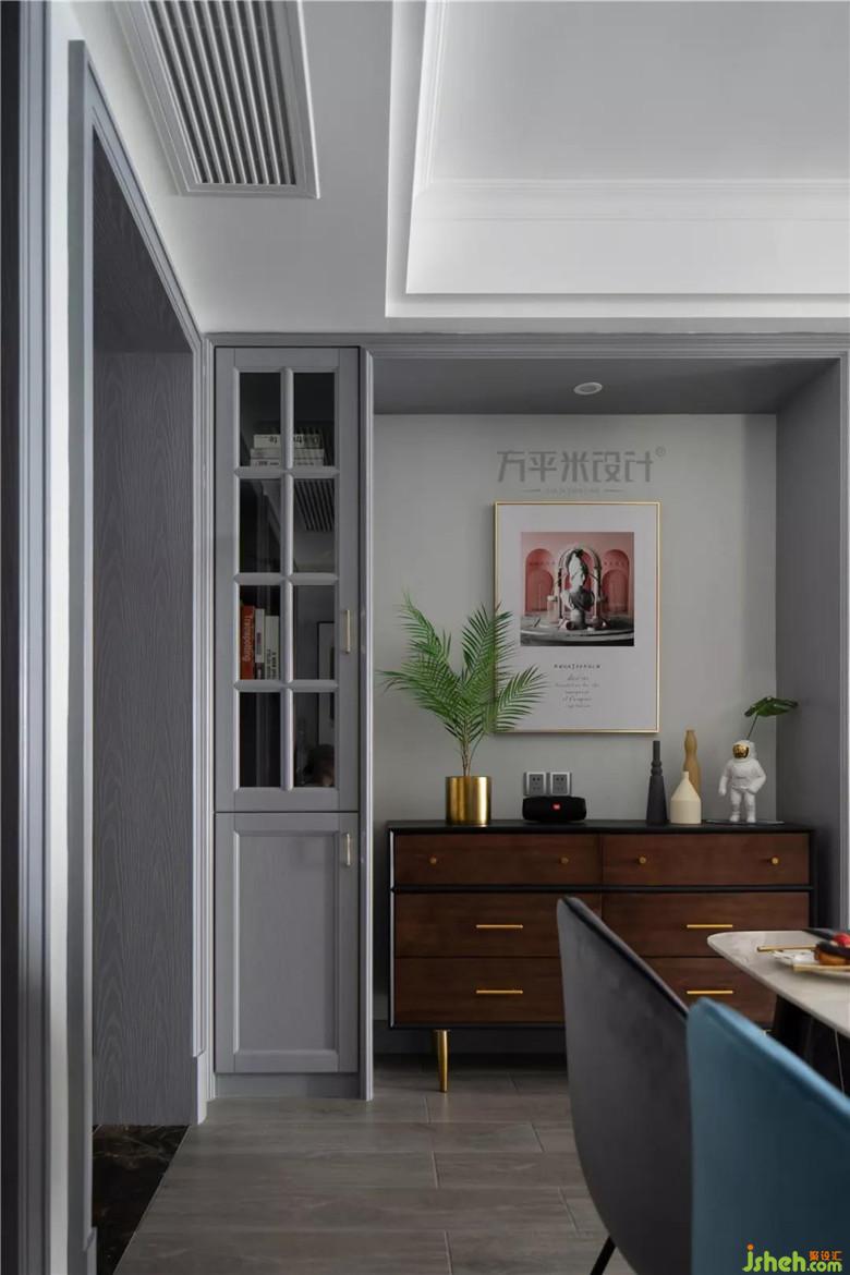 走廊通道一側(cè)的兩組對稱展示柜,中部留空嵌入斗柜,以保留縱向空間通透為主要考量,又提升了餐廳的收納及展示功能。