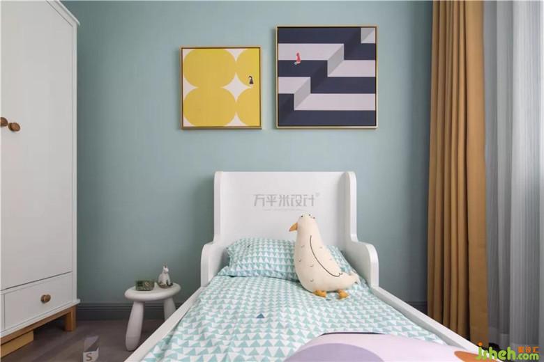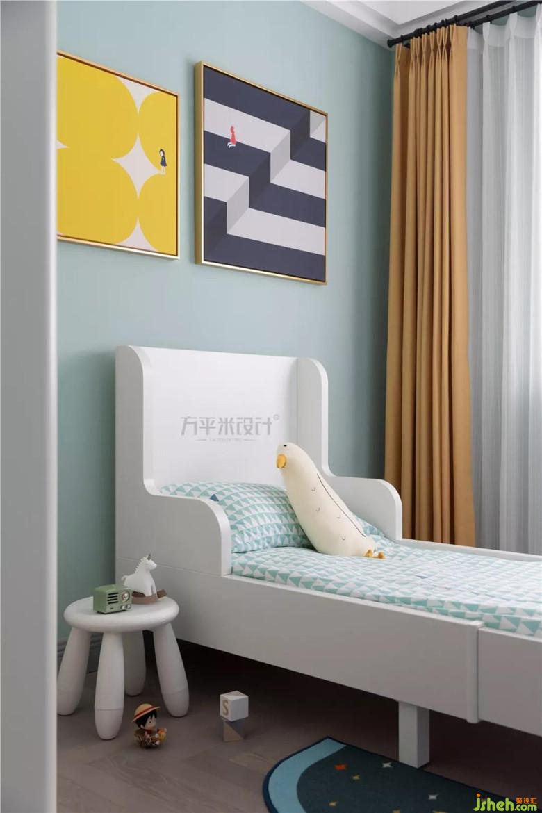 兒童房選用更加明亮的墻色,用明黃溫柔相搭,展示童趣天真的一面。幾何紋理的軟裝也從色彩上互為呼應(yīng)。選用邊角圓潤(rùn)的兒童專用家具。細(xì)心呵護(hù)寶貝的成長(zhǎng)之路。