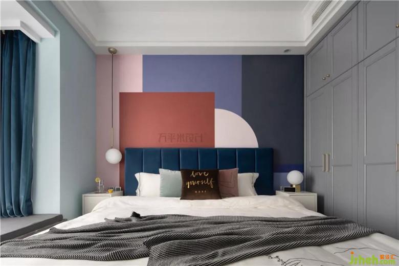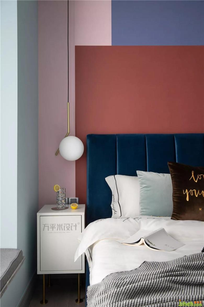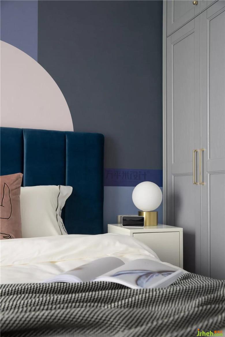 淡藍(lán)色基調(diào)的主臥,大面積幾何色塊的使用,于色彩上呼應(yīng)于客廳的靛藍(lán)磚紅撞色。窗簾從材質(zhì)及色彩形成呼應(yīng)及漸進(jìn)的層次。明亮飄窗成為舒適的延展區(qū)域。選用近似形狀的吊燈及臺燈,無聲于細(xì)節(jié)處對話,凸顯格調(diào)。