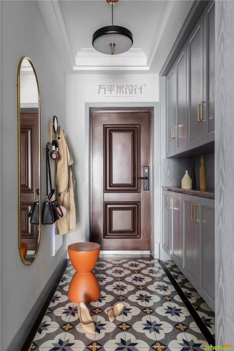 門廳設(shè)置中部及底部留空的鞋柜,方便置物及日常收納。鞋柜對面原為廚房入口,經(jīng)調(diào)整至餐廳使動線更為合理,墻面也有了安放穿衣鏡的位置。地面鋪設(shè)手工花磚,帶來復(fù)古情調(diào)。