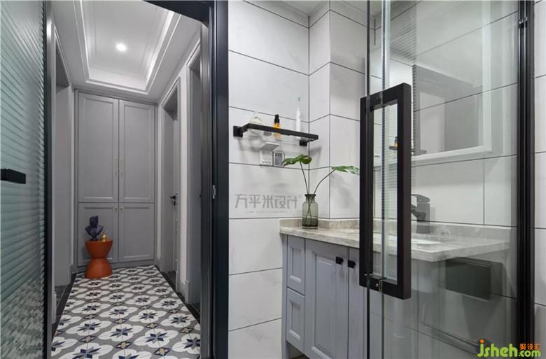 衛(wèi)生間面積不大,采用白色半啞光磚增大視覺空間感。定制嵌入式洗手臺,完美契合墻面。