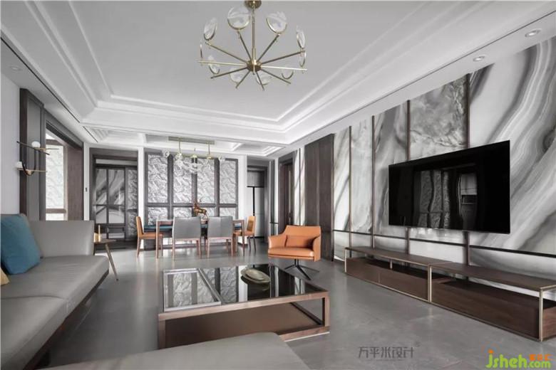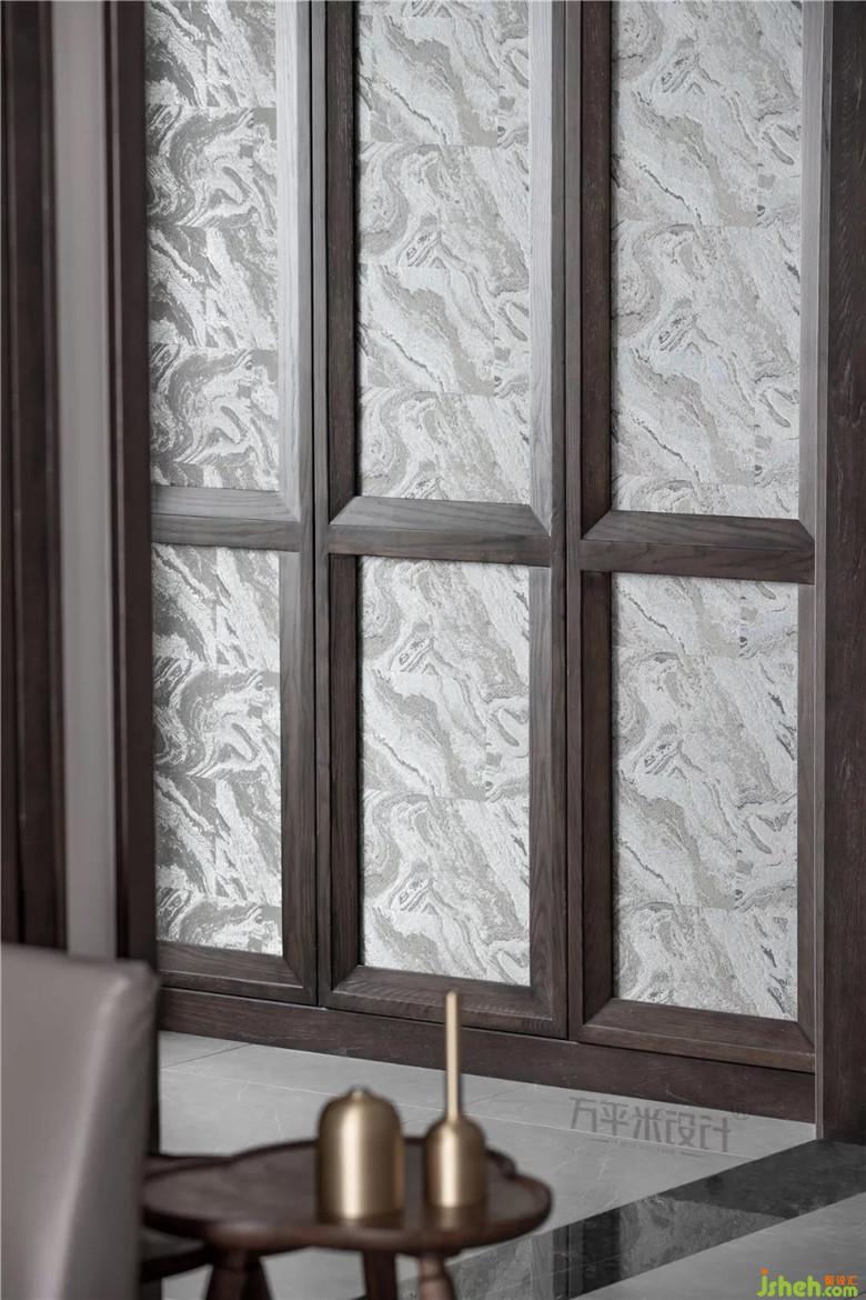 將云紋瓷片以考究比例內(nèi)嵌于窄邊框的原木線條內(nèi),令連貫的電視背景墻面似寫意山水,恢弘而生動。