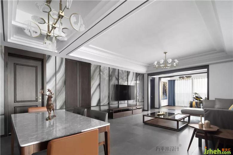 宜設(shè)而設(shè),精在體宜。刪繁去奢,繪事后素。因景互借,移步換景。方正而利落的橫縱線條于低調(diào)的灰色調(diào)中淺淺勾勒,使全屋中心的客餐廳區(qū)域顯得干凈通透,寬敞明亮。
