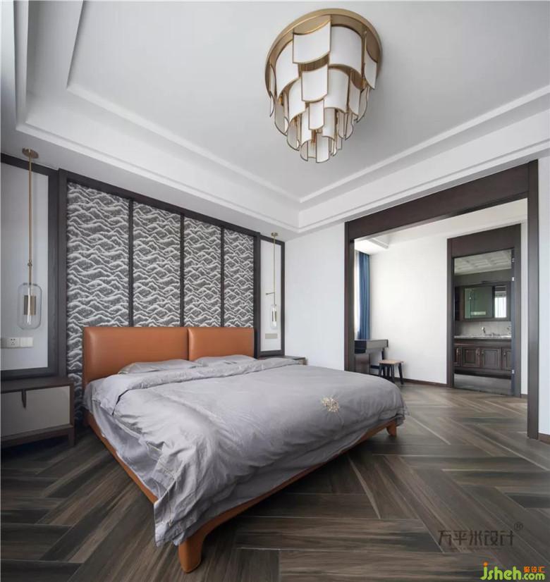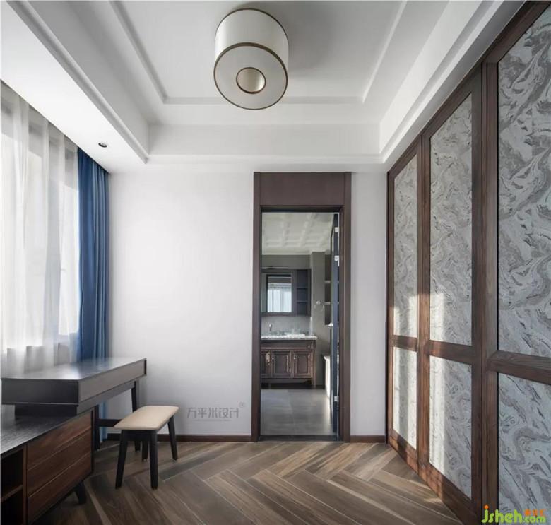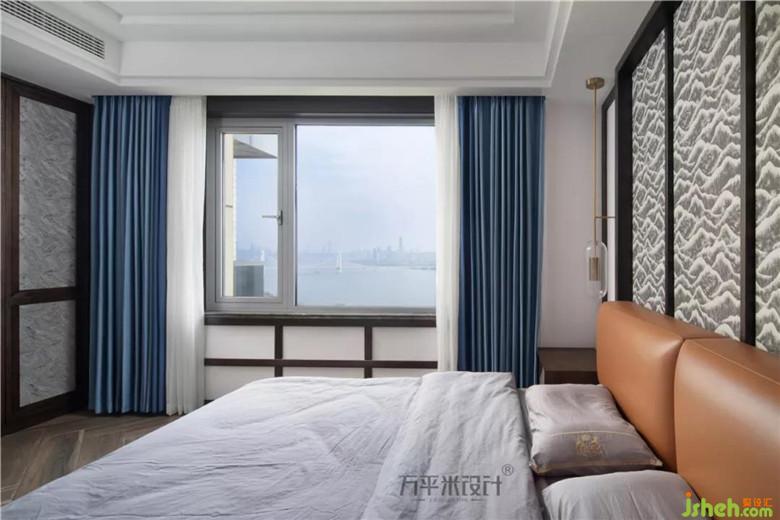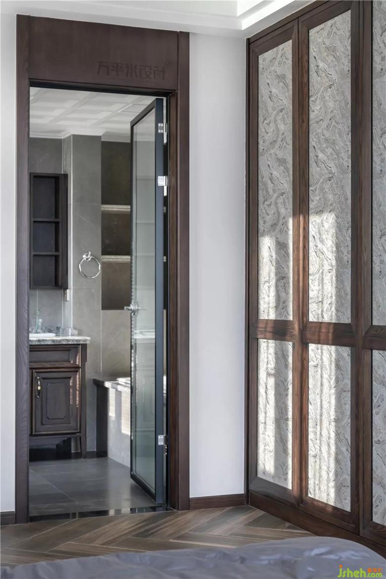 山紋圖樣的布料選擇,取依山傍水的寓意。床尾一側(cè)采取滿墻儲(chǔ)物衣柜來提升收納功能。窗外開闊江景一覽無余。清晨的陽光溫柔灑落,落日的余暉由水面侵染。開放式衣帽間作為主臥空間的延展成為統(tǒng)一的空間,明亮靠窗一側(cè)設(shè)計(jì)為梳妝臺(tái)。