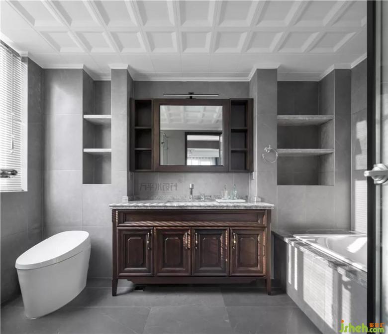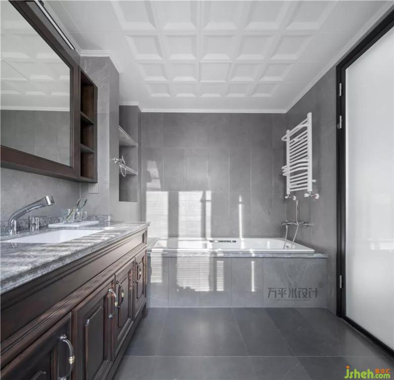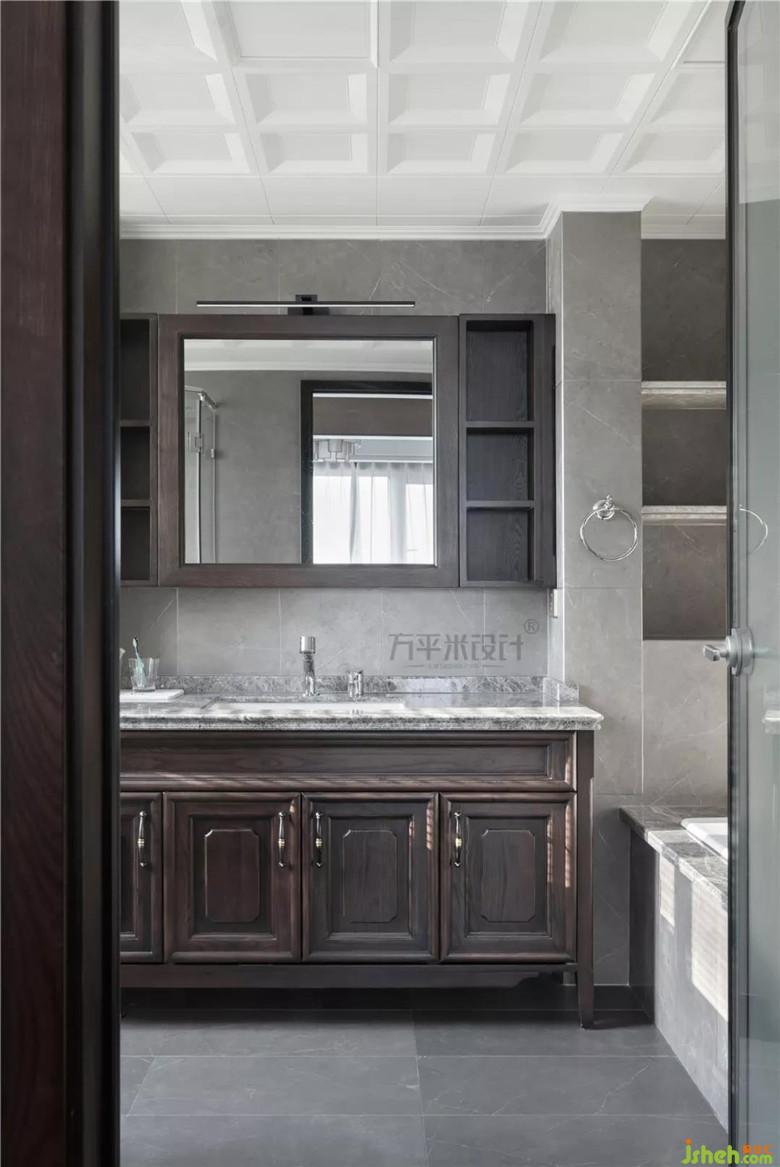 借用部分衣帽間空間后,主衛(wèi)從容安放淋浴房,浴缸,坐便,洗漱臺(tái)四大功能分區(qū)。利用包管厚度,設(shè)置出便于打理的大理石層板置物。定制的浴室柜及鏡柜內(nèi)嵌于墻面厚度內(nèi)。