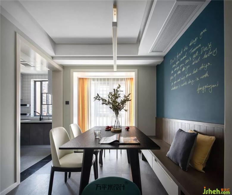 餐桌的墨色巖板臺(tái)面采用了耐腐蝕和高溫的火燒石,搭配墨綠色的絨面圓凳和奶白色的皮凳,與黑板墻的色彩在空間上充滿韻律和層次,薄款黃銅長(zhǎng)條燈將餐廳空間的橫豎結(jié)構(gòu)再次拉伸過(guò)渡,游刃有余。