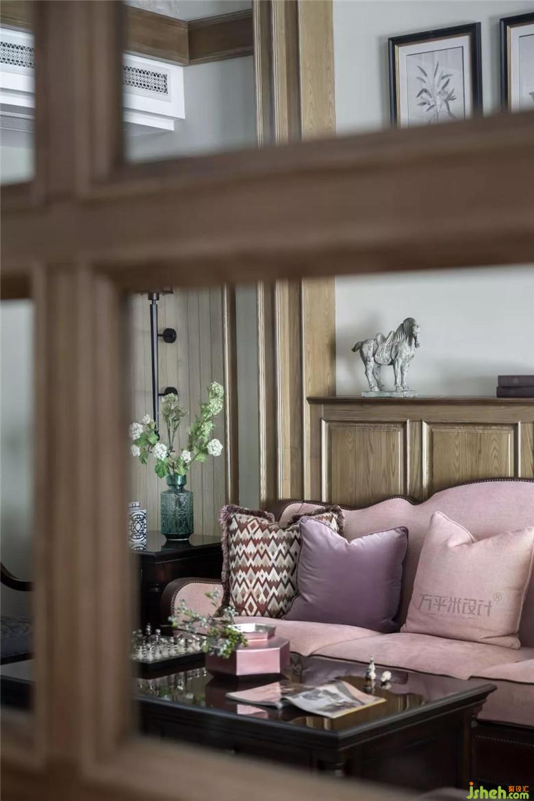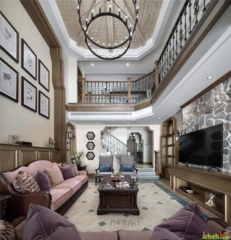 將回廊樓板外側(cè)中間設(shè)置木質(zhì)造型腰線,連接了回廊和主沙發(fā)背景,形成完美收口,宛如腰帶,連接上下。定制的鋁合金噴漆的藝術(shù)風(fēng)口,低奢美觀。過道墻面懸掛八個紫色浮花圓盤,別具巴洛克風(fēng)情,和客廳沙發(fā)顏色遙相呼應(yīng)。