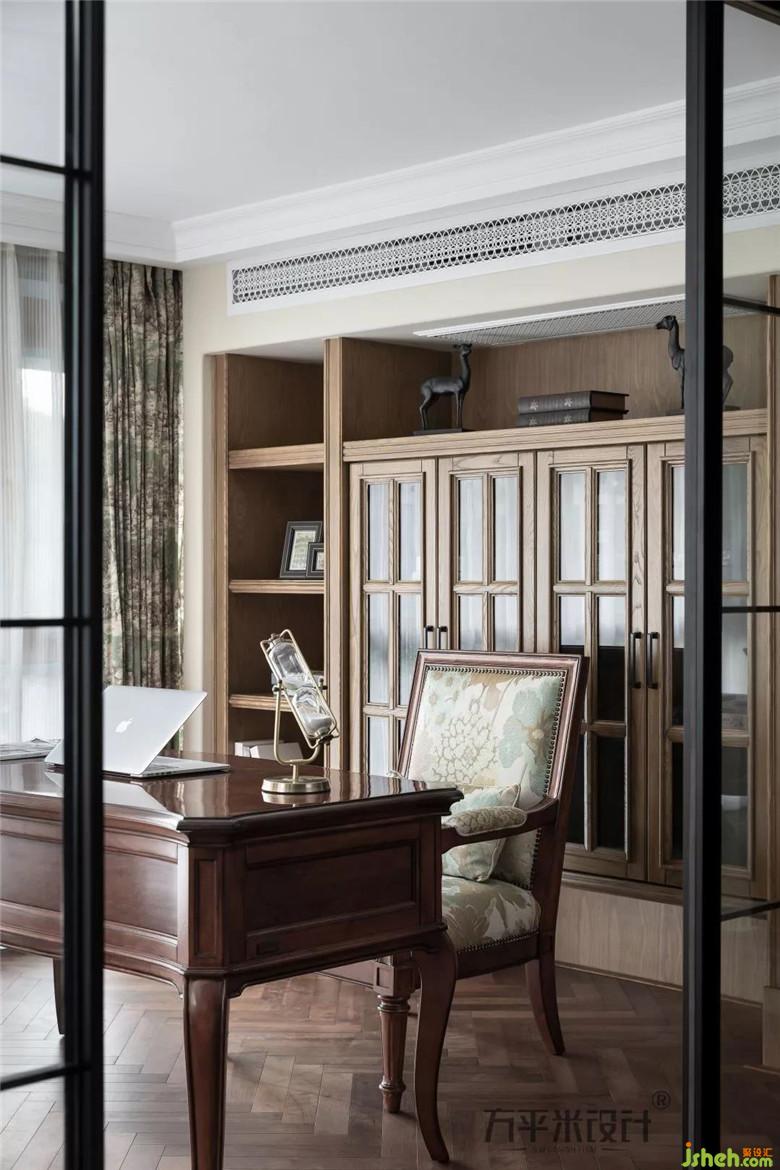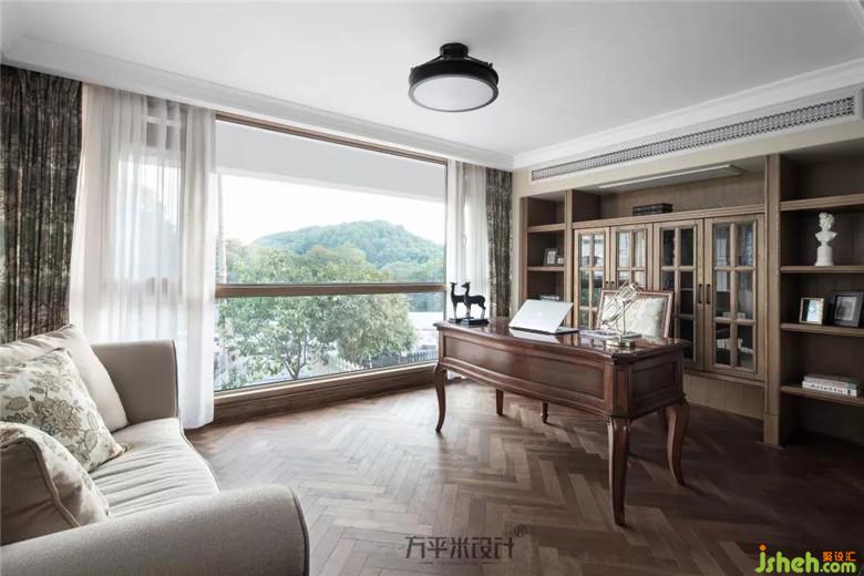 書房單獨(dú)設(shè)計(jì)在回廊的另一側(cè),是一層茶室上方加蓋樓板所形成。大大的落地窗,視野開(kāi)闊,可以直接看到西湖公園。迎著晨光和晚風(fēng),這方獨(dú)立的空間,靜謐安心,讓人可以帶著平和的思緒在這里學(xué)習(xí)小憩。