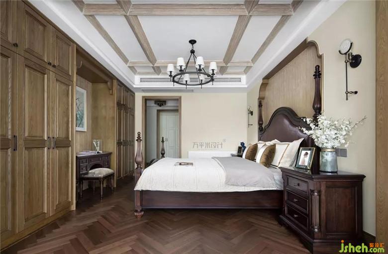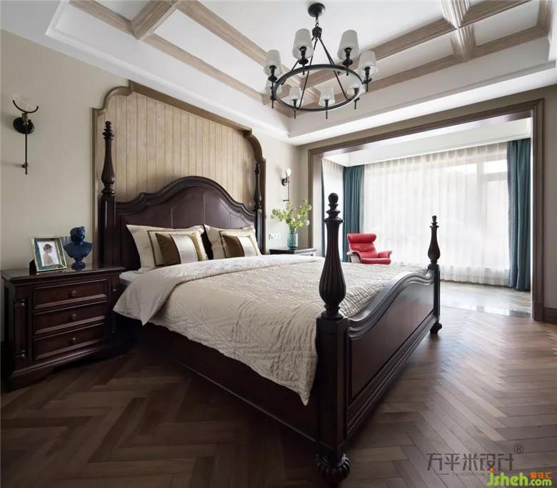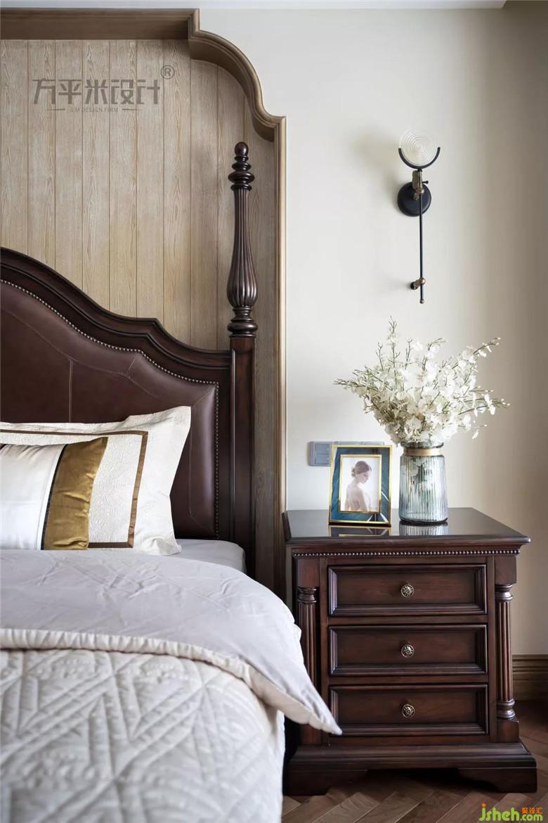 主臥以奶咖色墻漆與內(nèi)凹風(fēng)化白墻板造型結(jié)合,與頂面進(jìn)行分割,床體嵌入的同時(shí)也增添了整體的層次感。主床選用了皮質(zhì)靠背沿以金屬鉚釘扣,搭配經(jīng)典的美式木質(zhì)邊框。床線條勾勒細(xì)節(jié),木質(zhì)結(jié)構(gòu)穩(wěn)重舒適,帶著典雅莊重氣質(zhì),加上全房實(shí)木地板魚骨拼貼,形成傳統(tǒng)美式復(fù)古的圍合。