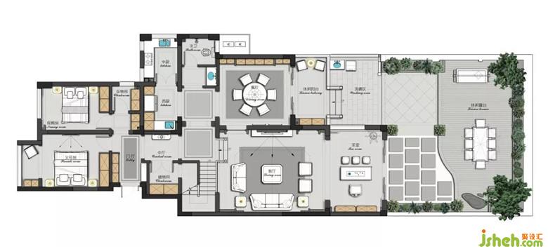 綠色是生機(jī)和活力,從客廳的茶室出來,在這方小花園中,業(yè)主精心打理的每片綠葉都顯出一種怡然自得的神態(tài),就像內(nèi)心充盈了幸福感一樣。別墅裝飾白色鵝卵石鋪滿了井字格,為防止積水,防腐木制成的木板搭在梅花樁上。在這里,一家人都可盡情享受四季灑落的陽光雨露。