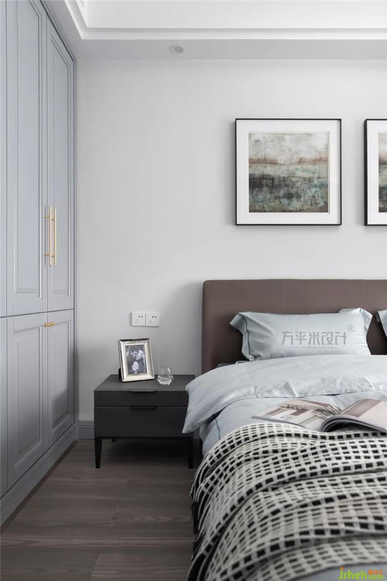 父母房軟裝裝修公司選配的顏色更為沉穩(wěn):棕色窗簾、深色床體及床頭柜、藕灰色床品,這樣較深沉的顏色更適宜父母的視覺感受體驗。