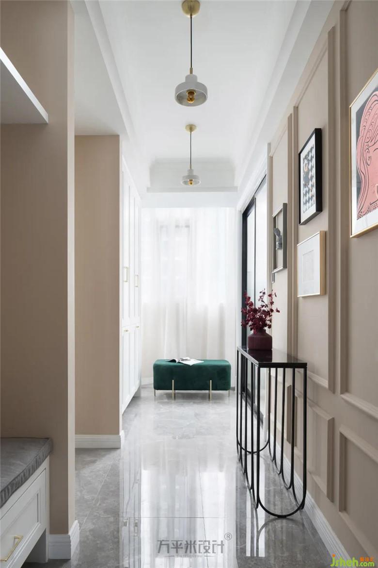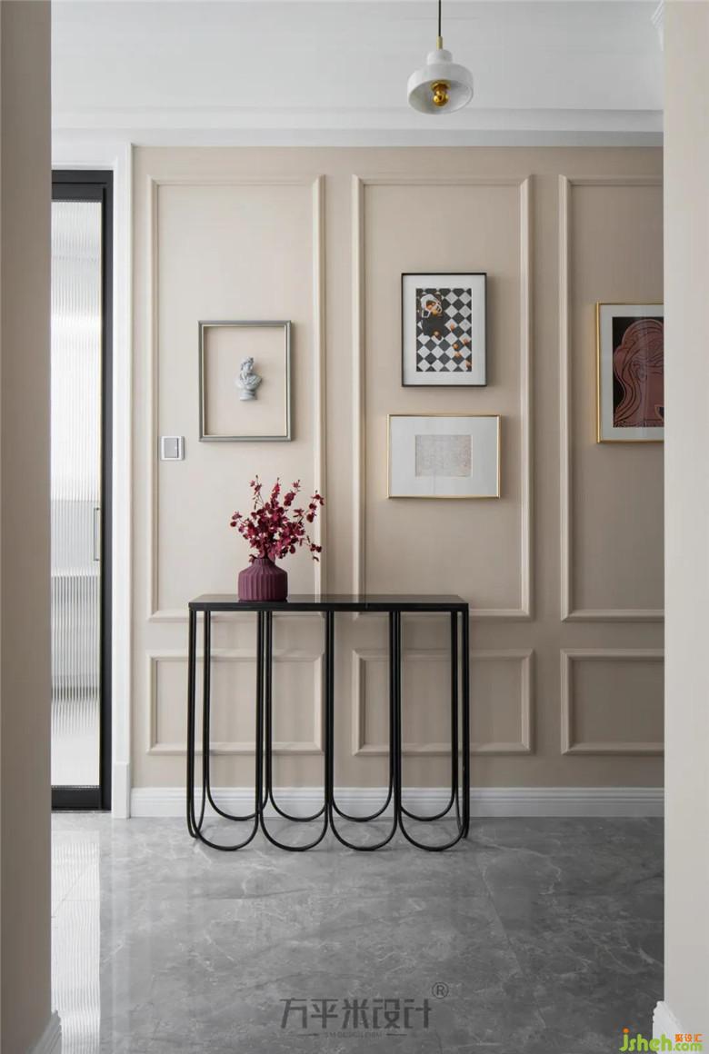 主墻裝修公司運(yùn)用簡單的線條,勾勒美式輪廓,搭配復(fù)古裝飾畫組與弧線形玄關(guān)臺碰撞出藝術(shù)的美感。