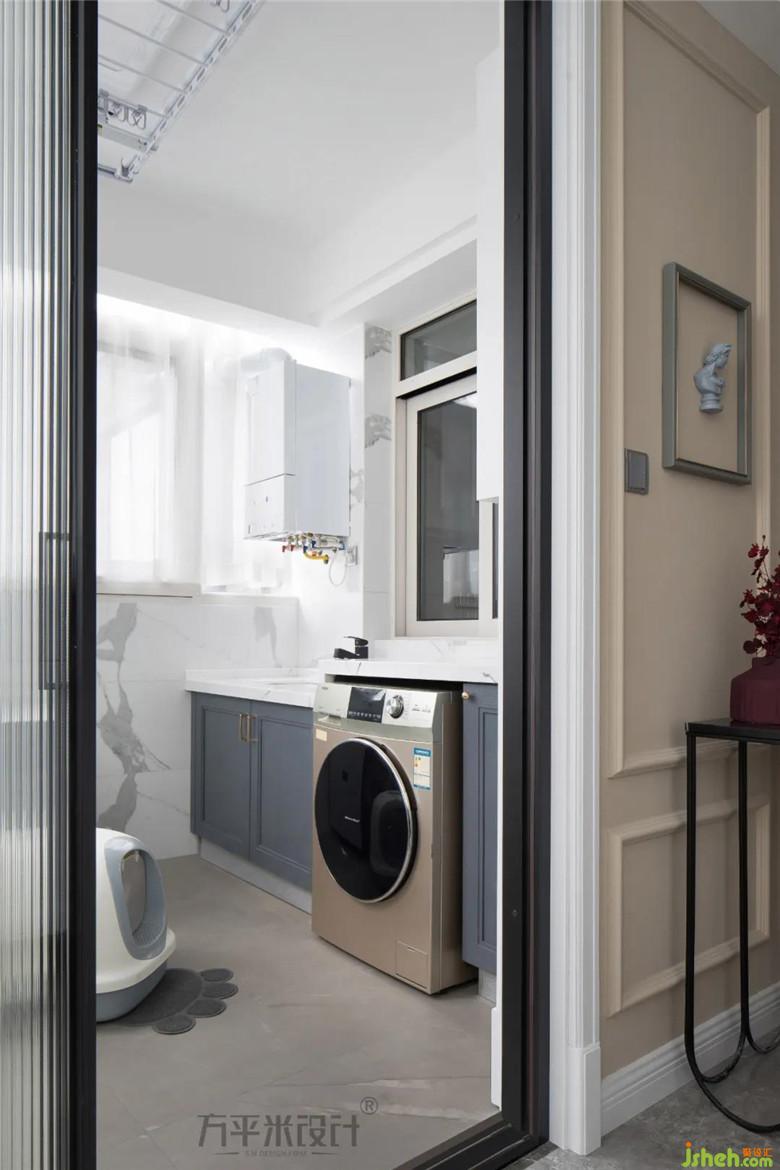 裝修公司利用長虹玻璃若隱若現(xiàn)的遮蔽效果,維系陽臺外觀的整潔視感。區(qū)域內(nèi)打造洗衣操作臺,讓洗衣機(jī)有個好的“歸宿”,同時縮短晾曬動線,讓日常生活更為便利。
