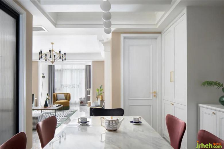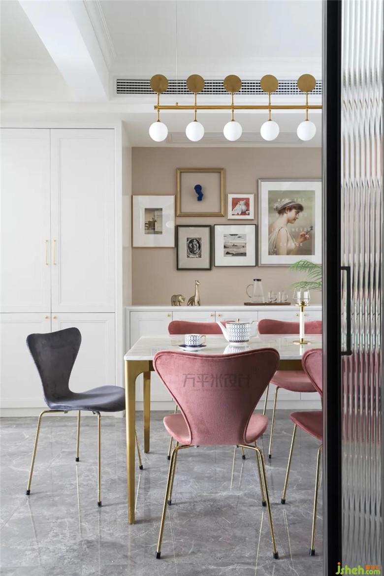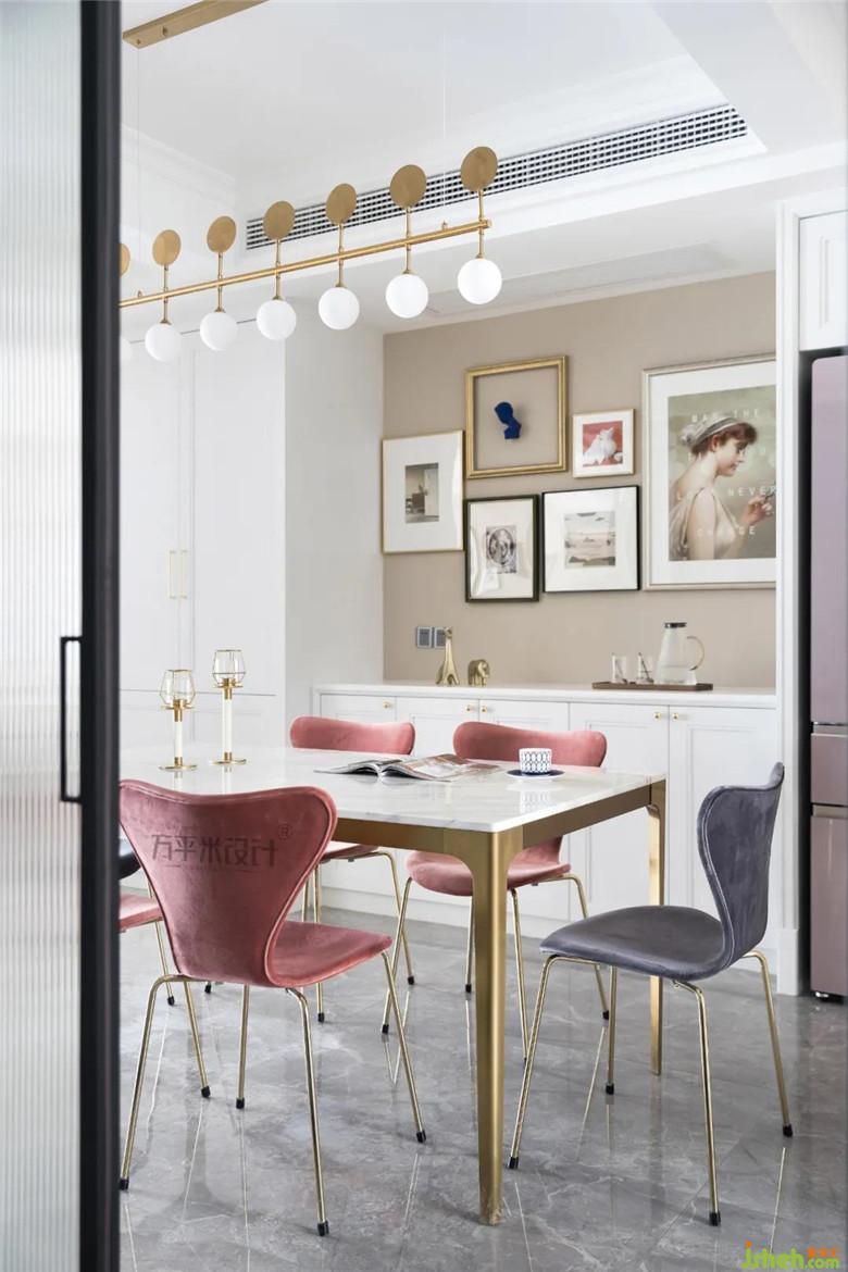 輕奢質(zhì)感餐桌與吊燈兩兩呼應(yīng),佐搭細(xì)腳絲絨餐椅,創(chuàng)造輕盈視覺感,也讓色彩鮮明的物件在空間中躍然跳動,彰顯休閑浪漫的就餐氛圍。