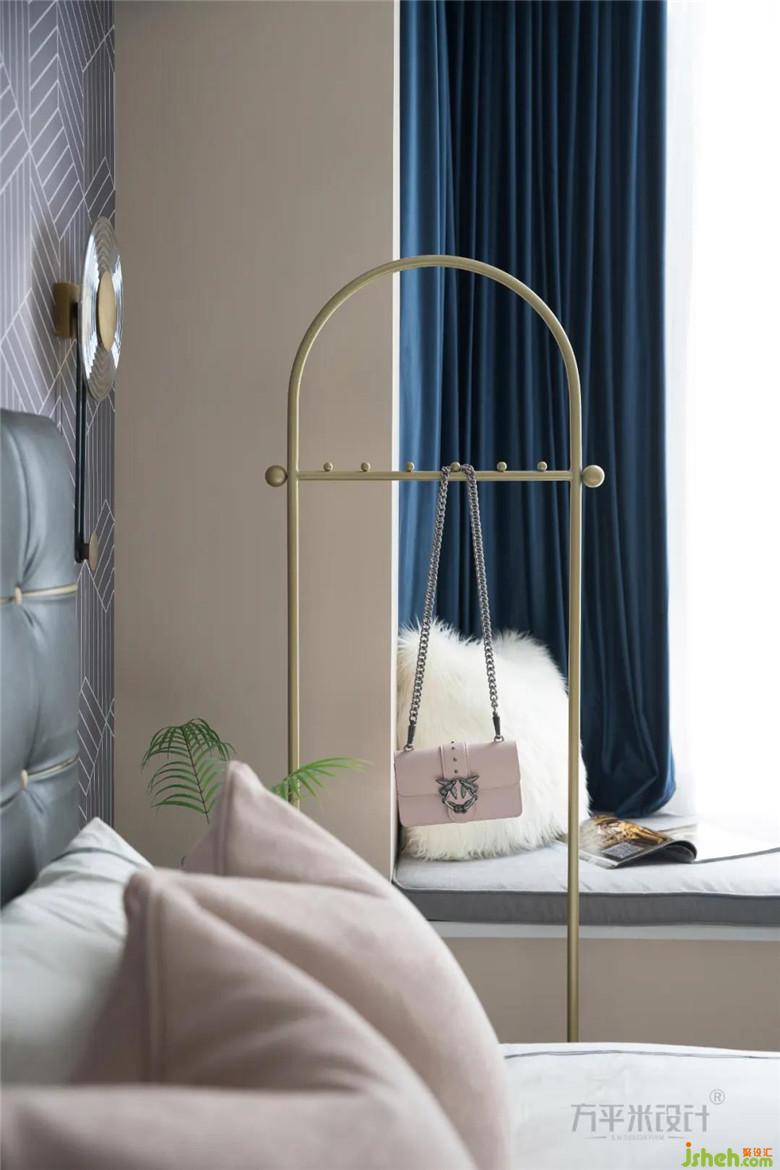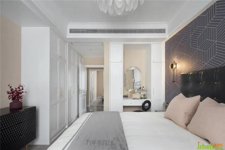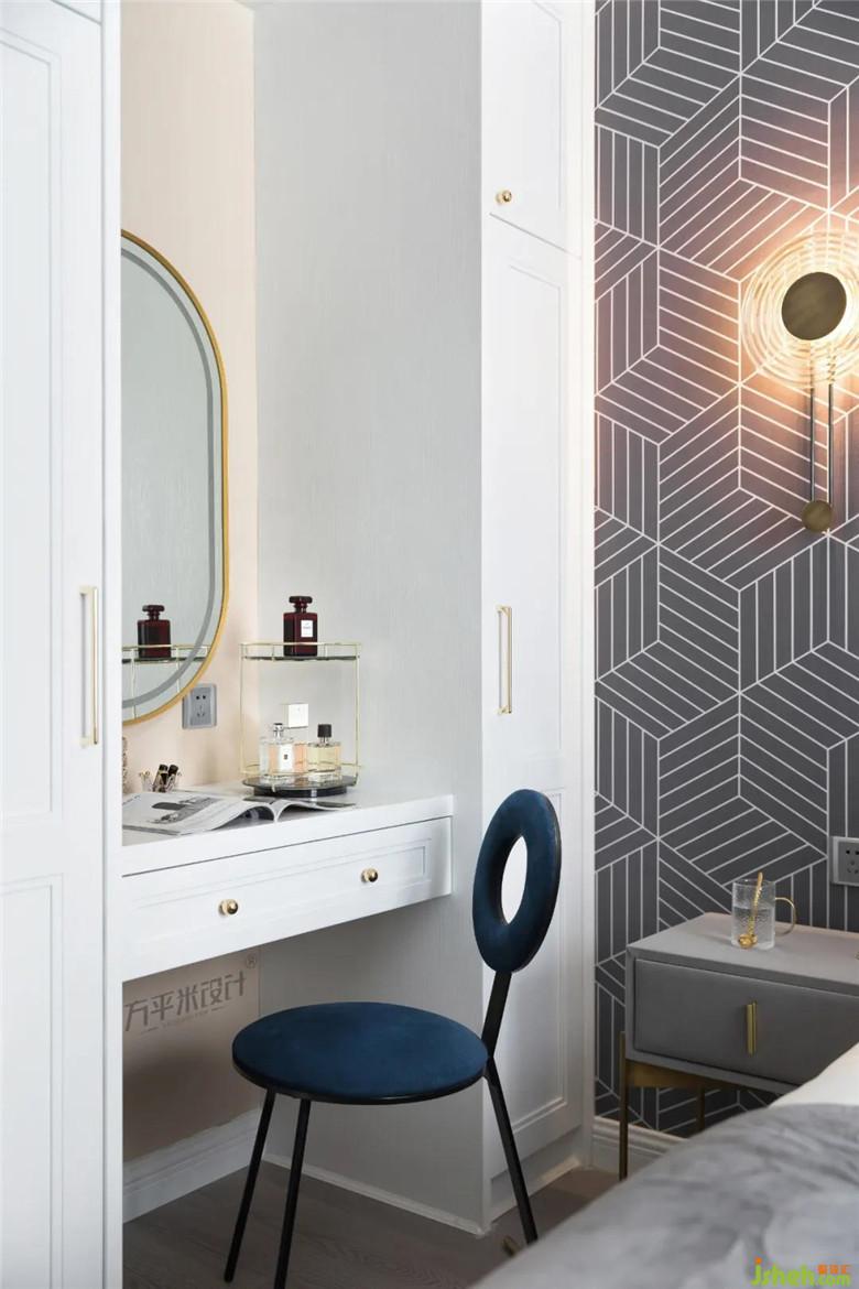 將梳妝臺(tái)與衣柜融為一體,與一側(cè)飄窗造型形成對(duì)應(yīng)關(guān)系,延伸空間視覺感。