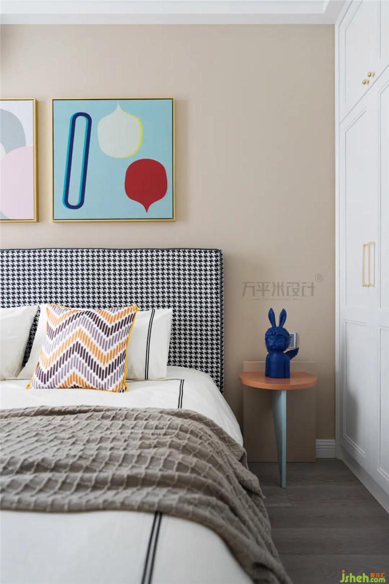 主臥中植入硬朗派的幾何線條墻布及深色系軟裝,打破以莫蘭迪粉為主的色調(diào)。在不同的色彩碰撞中,有了更鮮明的視覺呈現(xiàn),帶出沉穩(wěn)且溫馨的居家氣息。