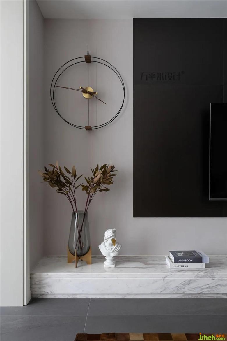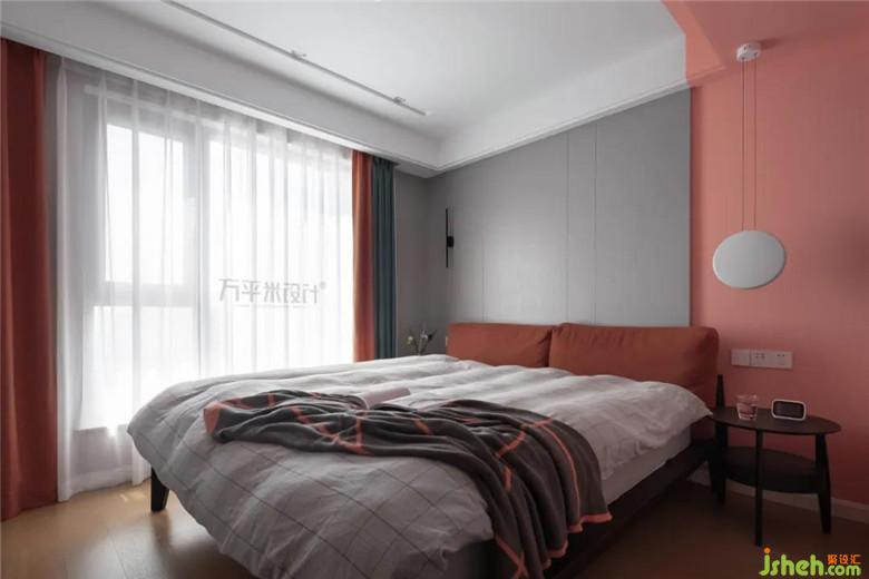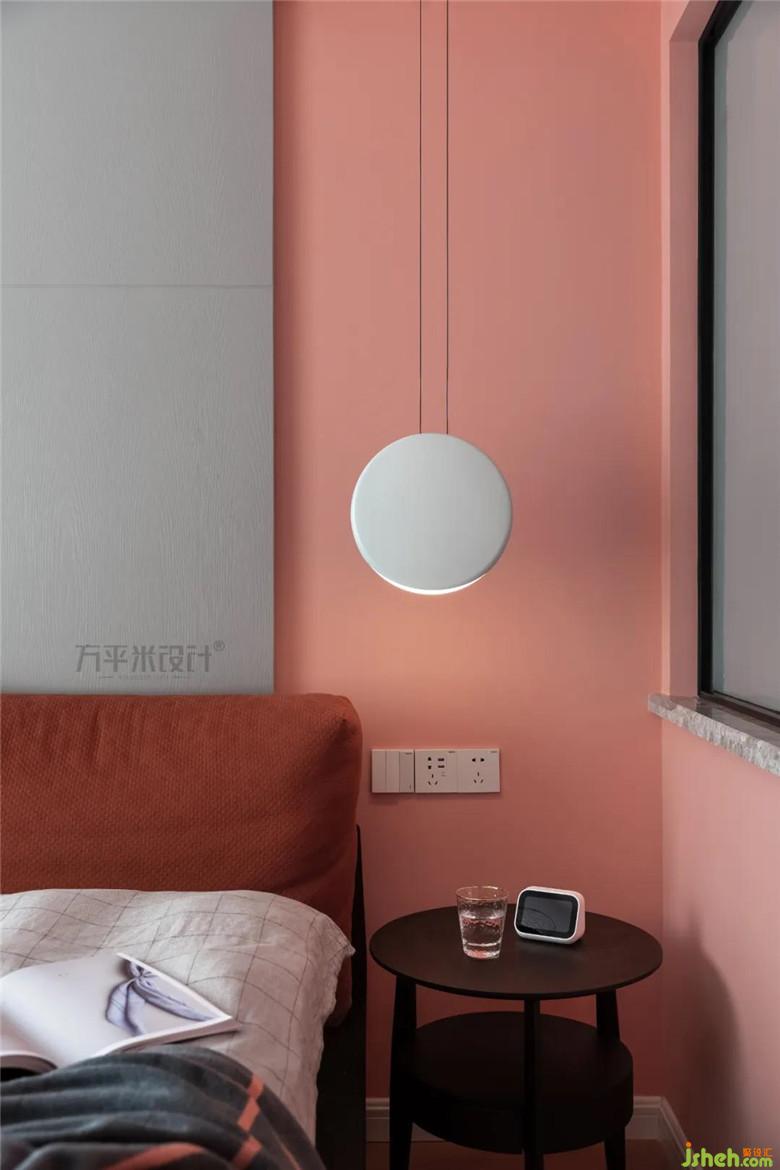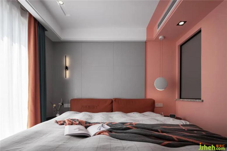 “適當?shù)拇竽懭ビ蒙?,反而會有意想不到的效果出現(xiàn)?!碑攦?nèi)斂的灰色與張揚的珊瑚粉拼接時,即是沉穩(wěn)感與浪漫感的混合,同色系的窗簾和深肉桂色的床頭軟包,實現(xiàn)了色彩上的過渡和連接,共同構(gòu)筑和諧而有層次感的空間面貌。