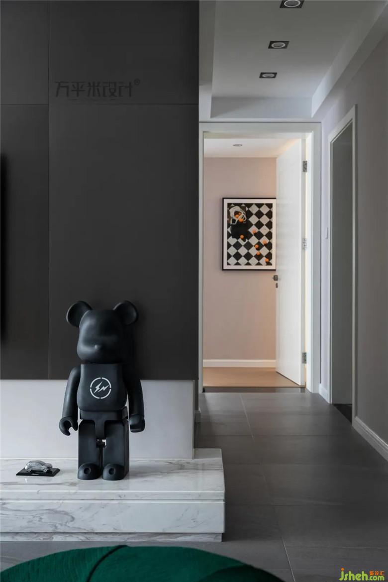 不銹鋼面板延續(xù)至過道一側(cè),使區(qū)域間過渡緩和。地臺上的Bearbrick積木熊擺件瞬間增添不少的藝術(shù)氣息。