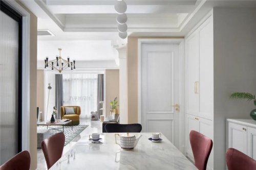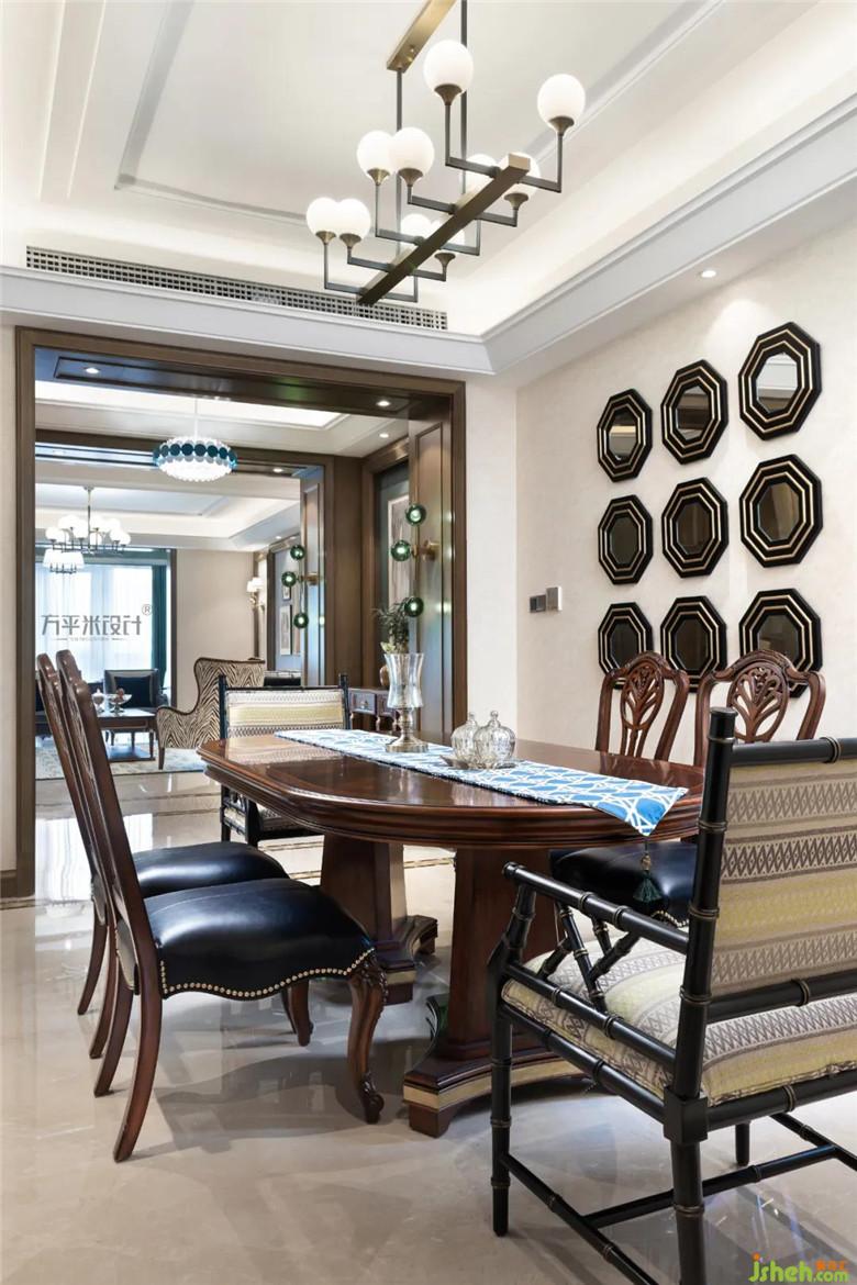 裝修公司設(shè)計(jì)過程中繼承著傳統(tǒng)文化思想,特意搭配兩把中式造型餐椅與美式家具進(jìn)行混搭,其內(nèi)在的東方韻味與木色調(diào)的質(zhì)樸感相交織,刻畫出不同文化之間的沖突感,顯現(xiàn)出時(shí)代的印記。