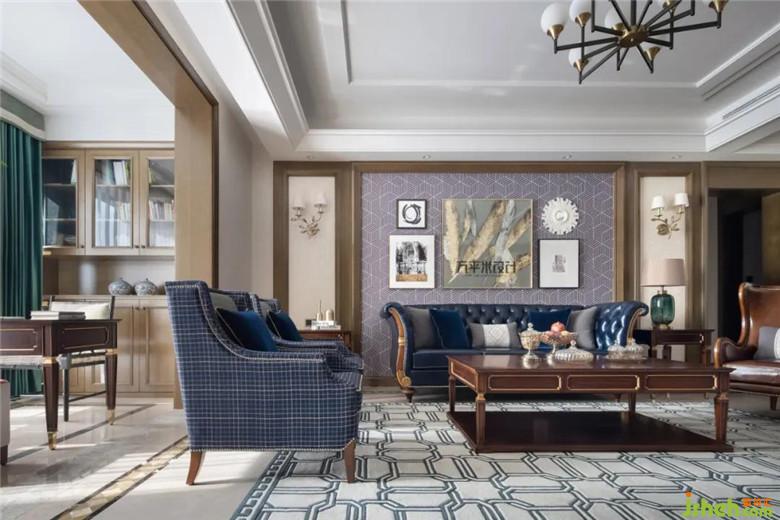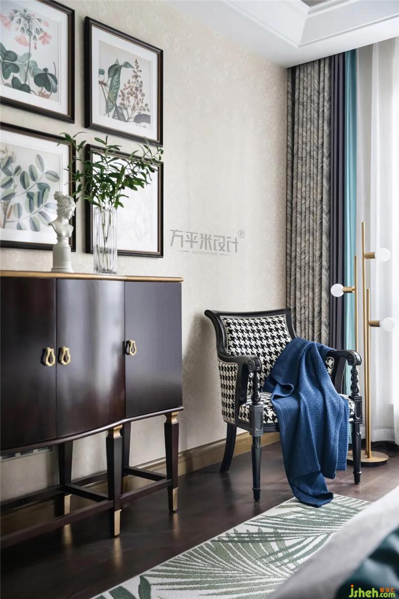 仔細看會發(fā)現(xiàn),茶幾側(cè)面板,沙發(fā)扶手,木飾面邊條,裝飾畫框及吊燈都有金色元素,用意在于提升細節(jié)處的精致度,營造輕奢質(zhì)感。