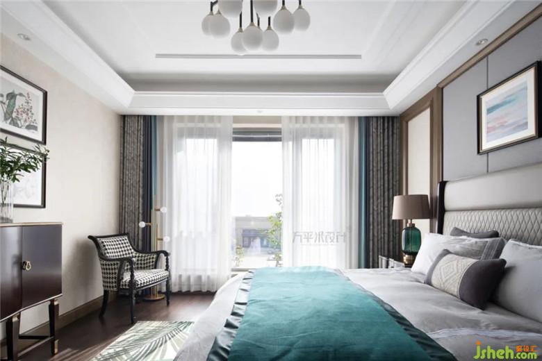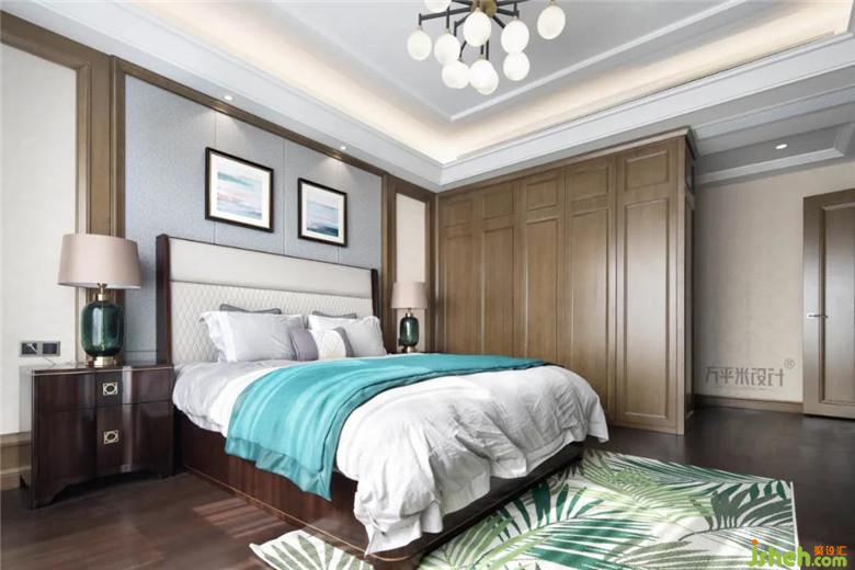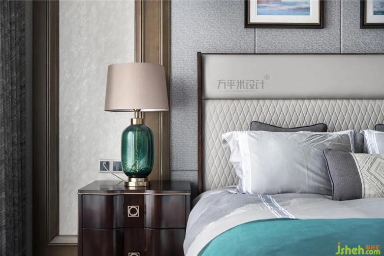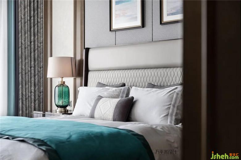 灰色紋理硬包與木質(zhì)肌理邊框相互襯托,搭配色調(diào)柔和的抽象裝飾畫,織構(gòu)出一室溫潤。
