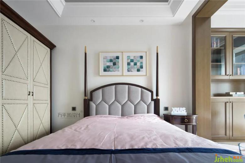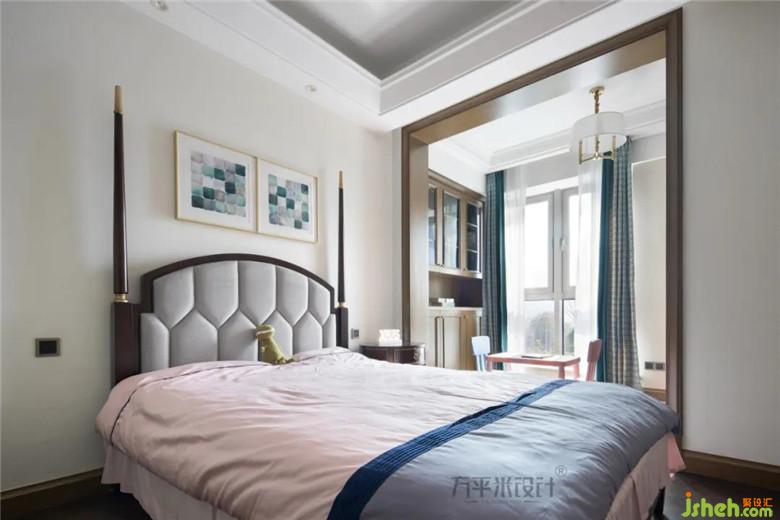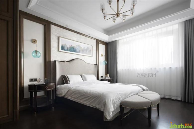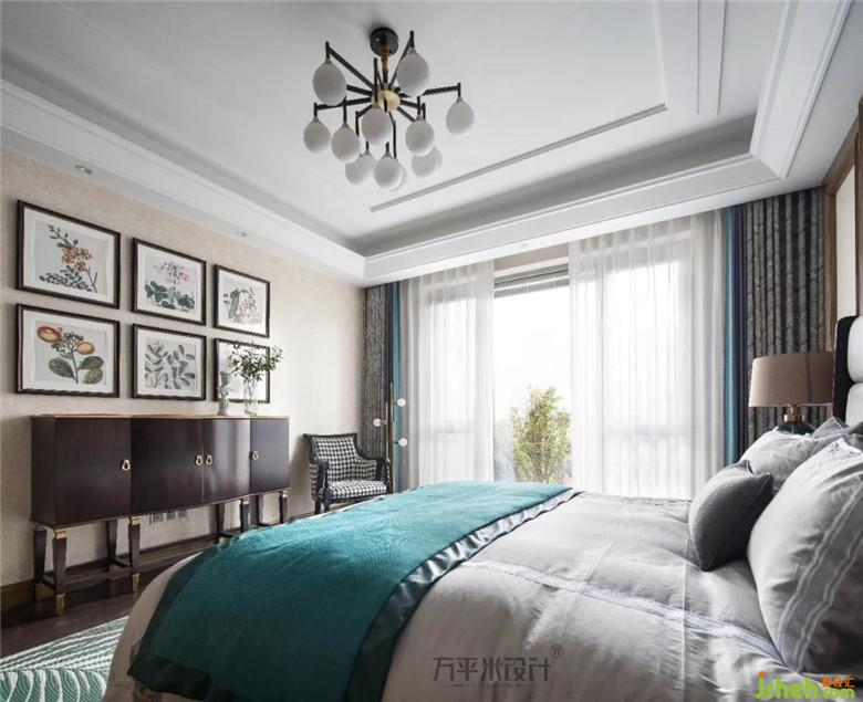 白色紗簾與拼接印花的遮光簾,復古的暗色斗柜及優(yōu)雅姿態(tài)的千鳥格單椅,自然氣息的地毯呼應植物聯(lián)排裝飾畫,材質與色調的協(xié)調關系,恰到好處的呈現(xiàn)整體美感。