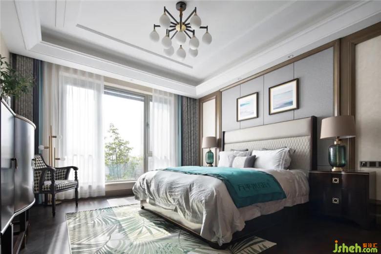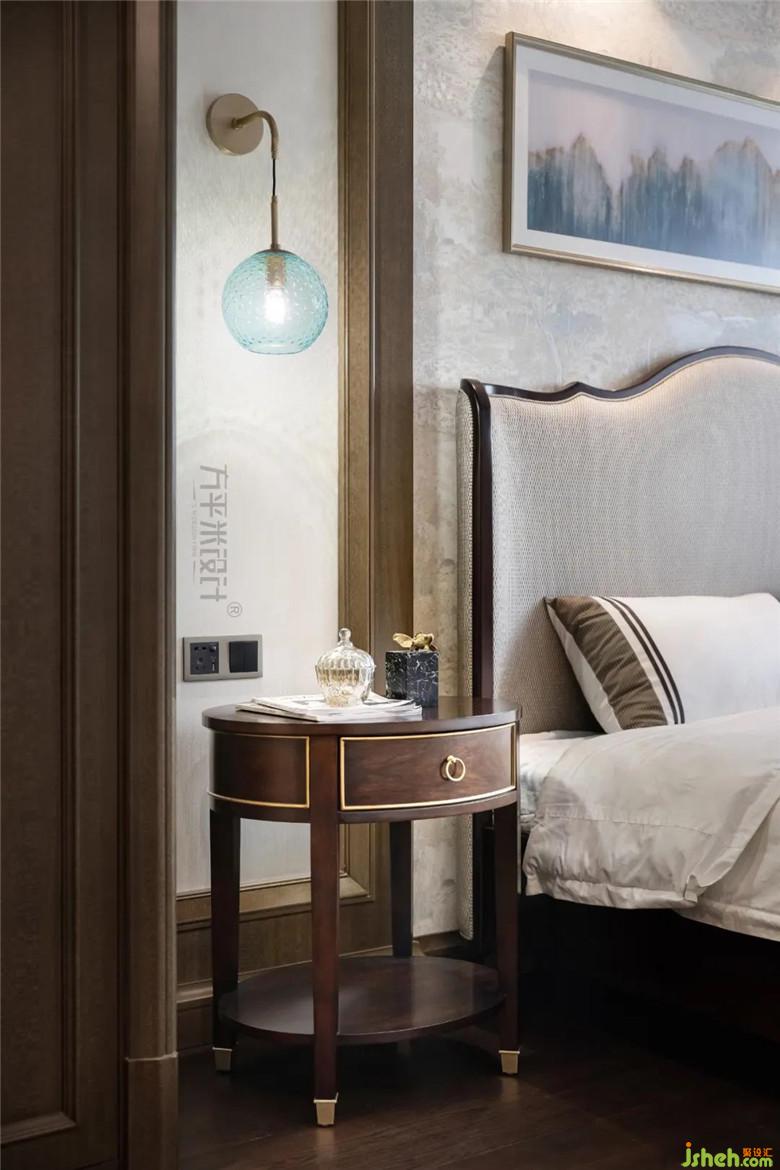 在燈飾的選擇上,以魔豆燈為空間提供整體的均勻照明,一側墨綠床頭燈則對一些重點區(qū)域單獨投光,靠近窗戶的金屬落地燈主要起到裝飾作用,豐富整體空間層次。