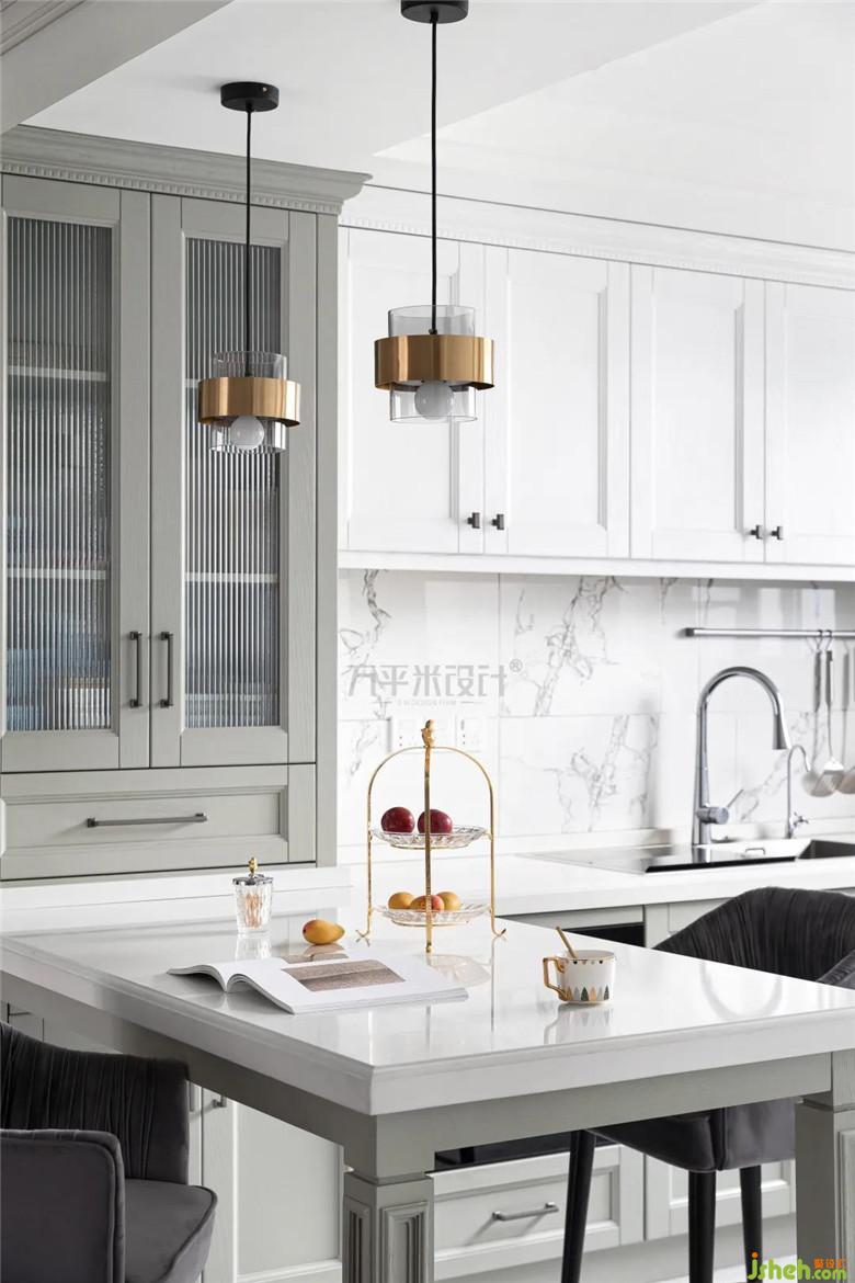 形成流暢無礙的料理與就餐動線同時鋪貼潑墨大理石墻磚展示輕盈明亮的空間感