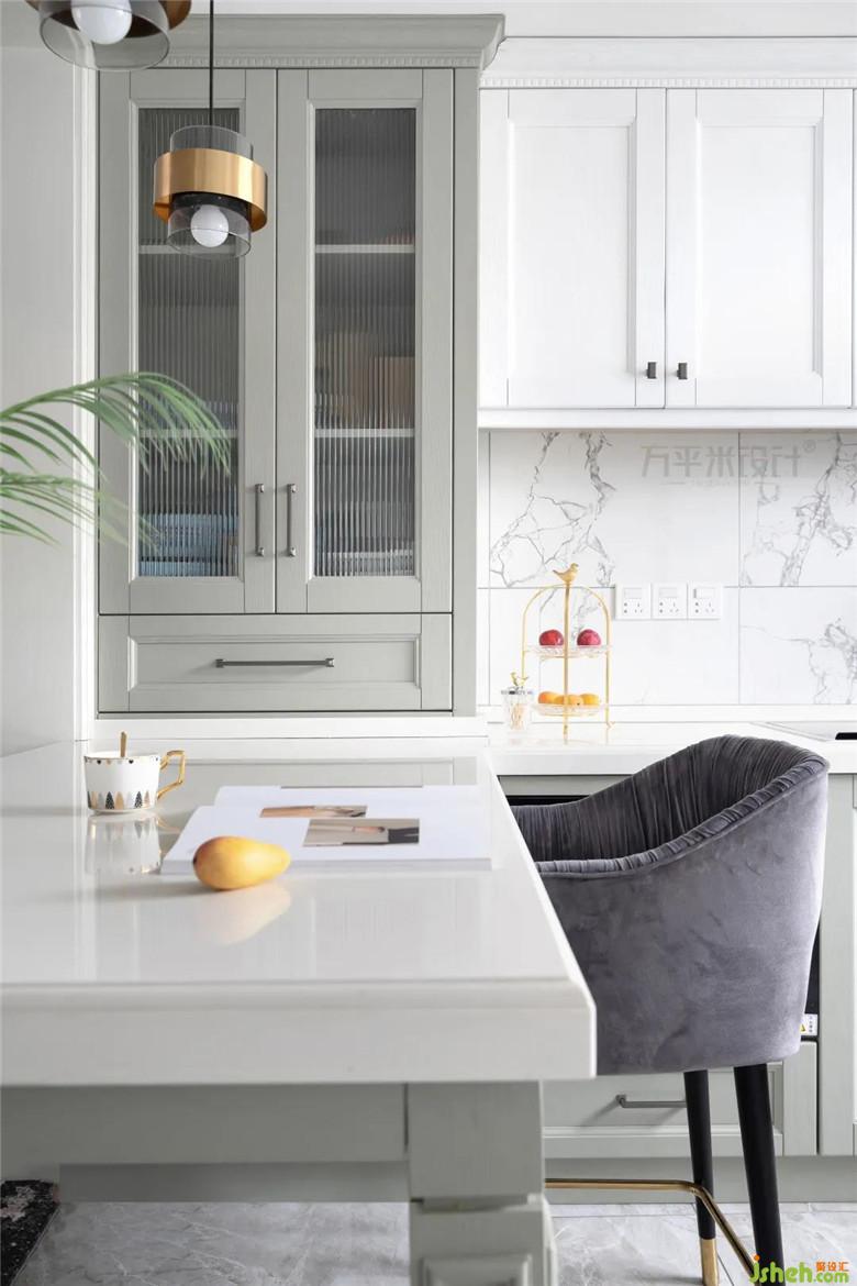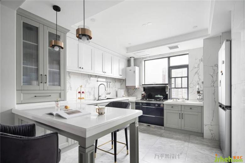 沿著廚房格局定制灰綠色櫥柜與餐桌