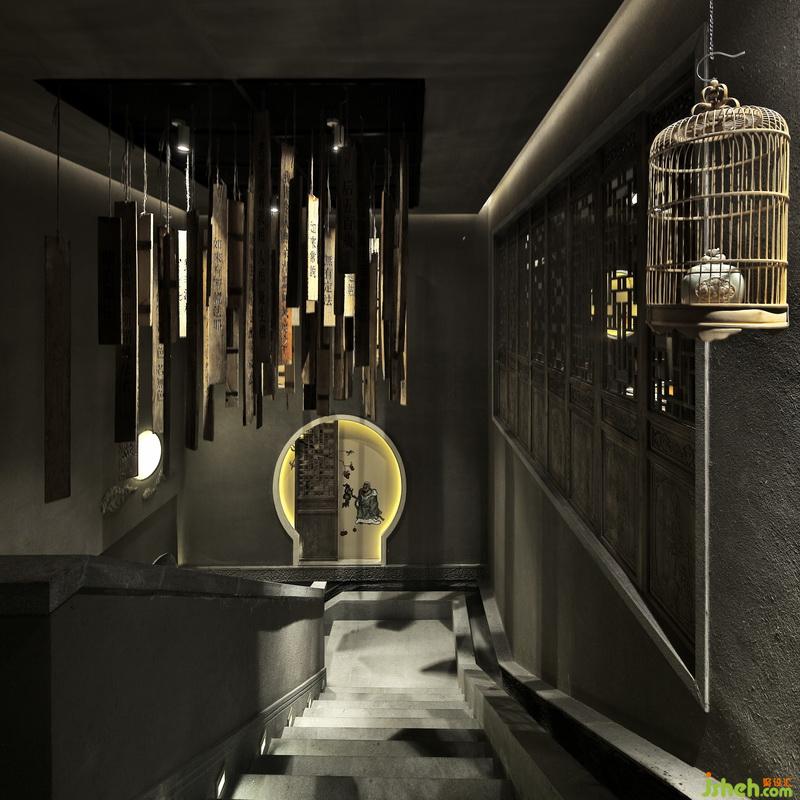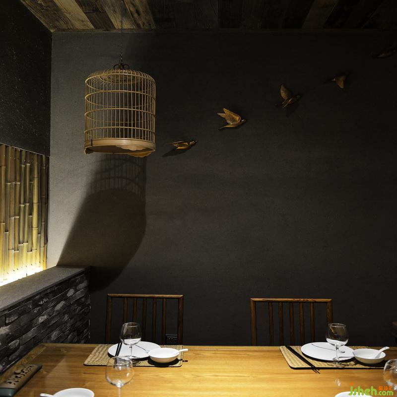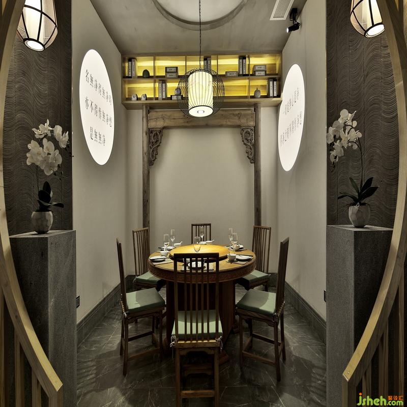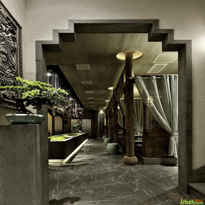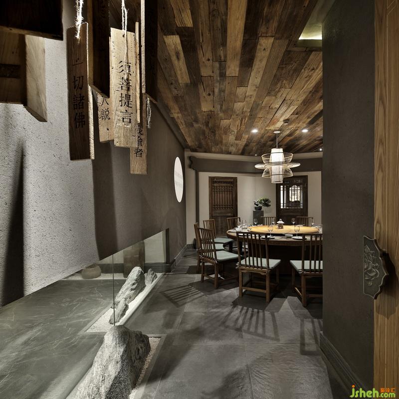 禪家所謂“大死一番,再活現(xiàn)成”。是強調(diào)萬法空性,而不泯滅生命活潑之氣。最大的包廂兩側(cè)安設(shè)了巨幅的半鏡面不銹鋼波浪板和刻滿經(jīng)文的舊木板,室內(nèi)的木構(gòu)與自然輕盈呼吸對流,引入清風竹林幽幽之意,錯落的浮雕佛像在空間遠、中、近景的轉(zhuǎn)換開合自如,行移之間,意境悠遠。