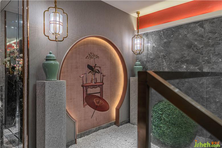 室內(nèi)設(shè)計師將外場空間進(jìn)行了有層次的遮擋與半通透,其中巧妙地運用了中國園林的窗洞,使景中有畫,畫中有景,兩者相得益彰,形成良好的視覺中心點。餐廳設(shè)計