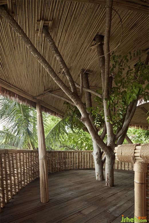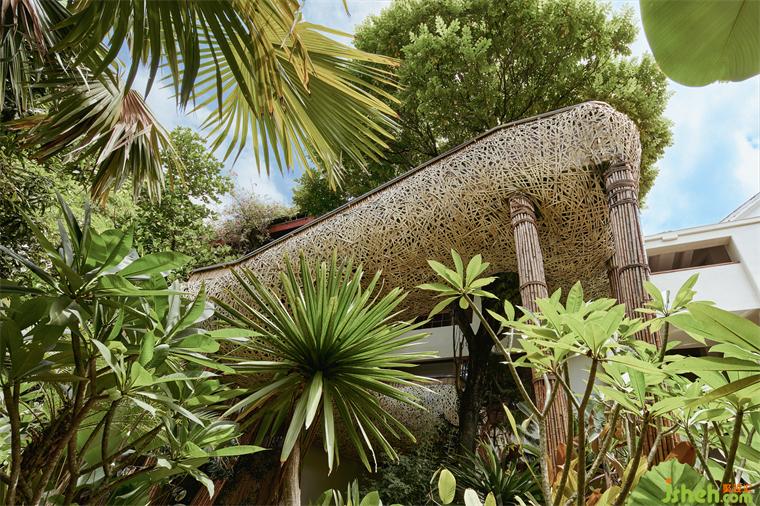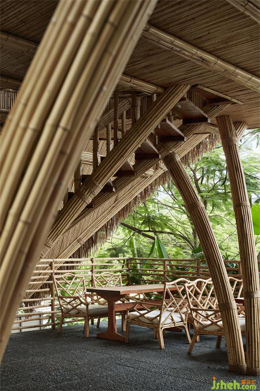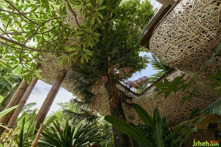在樓梯外的延伸空間,我們選擇采用版納傳統(tǒng)的竹編古法技藝,會所設(shè)計為這個空間創(chuàng)造了一種與自然深度連接的機會,仿佛將內(nèi)外世界融為一體。這里不僅有獨特的觀景體驗,還有自然的治愈力量。