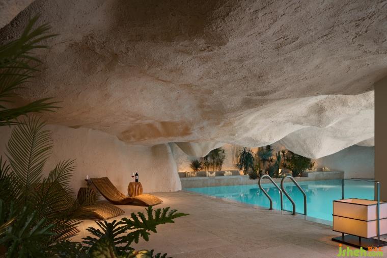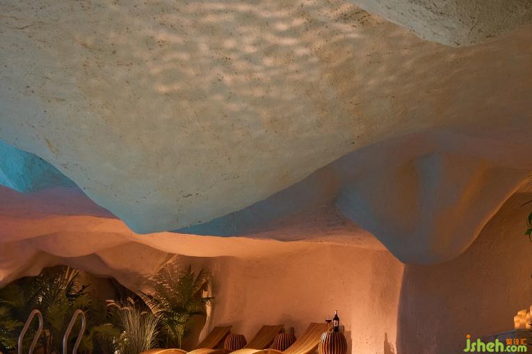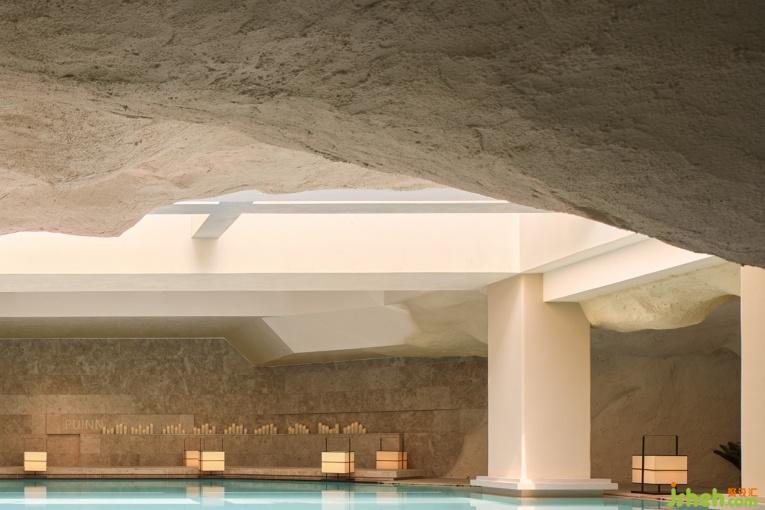 酒店設計泳池區(qū)域設計靈感源自對一片神秘地下源泉的發(fā)現(xiàn),暗流涌動的地下溫泉傳說會勾起每一顆因好奇而去探索的心。頂部的曲線與高低起伏,塑造出如天然溶洞一般的壯觀奇景。
