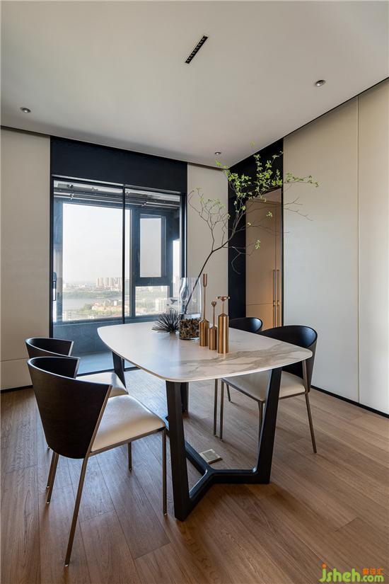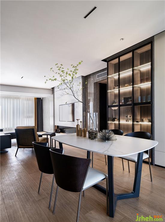 餐廳與客廳之間沒(méi)有明顯的邊界,在設(shè)計(jì)手法上將空間塊面之比例進(jìn)行調(diào)整,達(dá)到平衡穩(wěn)定。分割線確立之后,運(yùn)用機(jī)能不同的啟合方式,讓空間之相容性達(dá)到最大。造型干凈利落,凸顯現(xiàn)代簡(jiǎn)約的生活質(zhì)感與低調(diào)的奢華。現(xiàn)代極簡(jiǎn)的干凈利落與當(dāng)代質(zhì)感的美學(xué)風(fēng)度演繹得淋漓盡致。家庭裝修設(shè)計(jì)