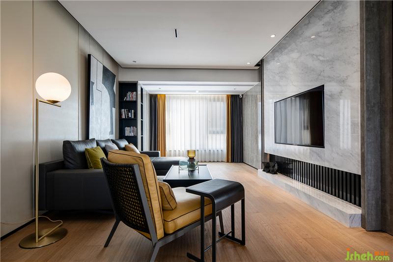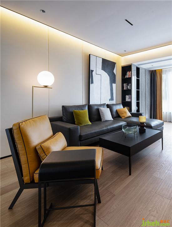 客廳:米白、高級(jí)灰的主色調(diào),奠定了空間沉穩(wěn)內(nèi)斂的底色,沙發(fā)背景簡(jiǎn)練幾何線條與純粹色彩恰到好處的糅合,深灰皮質(zhì)沙發(fā)與黃色靠椅的組合,帶給人以冷靜的精致感的同時(shí)又合理避免了空間單調(diào)之感,黃色系的點(diǎn)綴給空間增添活力。