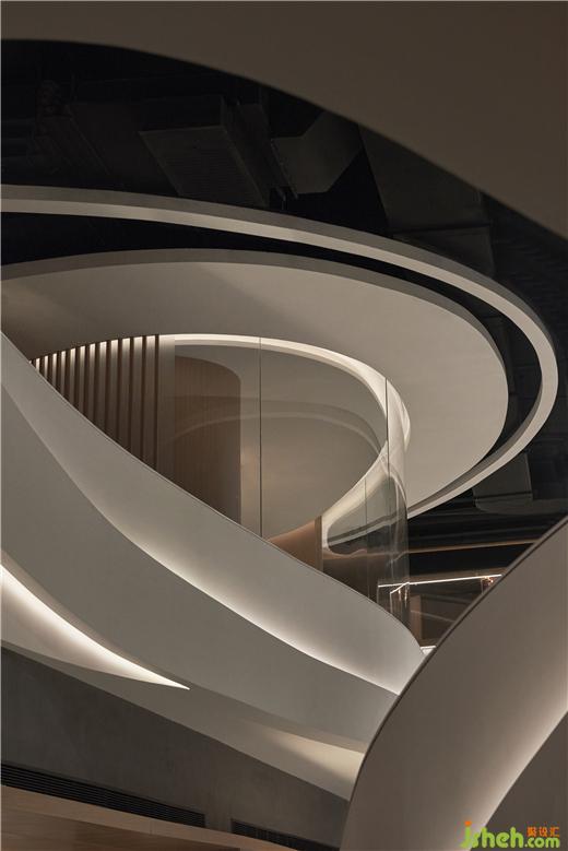 規(guī)整的空間內(nèi),一道扶搖而上的白色樓梯成為空間中的視覺重點(diǎn),自由流暢的曲線好似連綿的山脈。自助烤肉PLUS設(shè)計(jì)軟化了空間單一的直線構(gòu)成的同時(shí)也呼應(yīng)了品牌理念。
